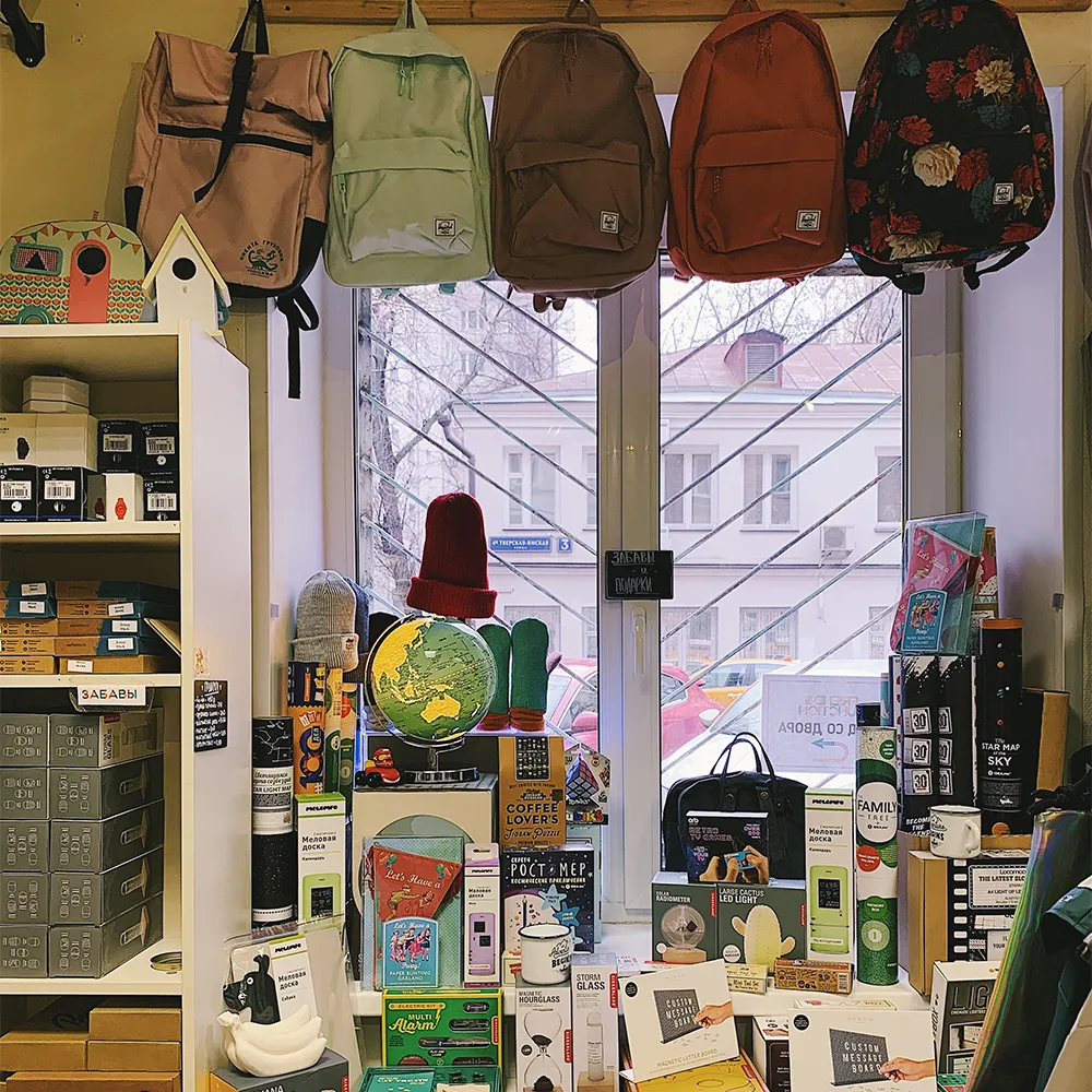 Тут закладывается наша база иностранных поставщиков: немецкие рюкзаки PinqPonq и шведские Sandqvist, огромные шарфы из Непала, бельгийские очки Komono, английские забавы REX London и Kikkerland, австралийские стаканы Stojo и много-много других прекрасных брендов.