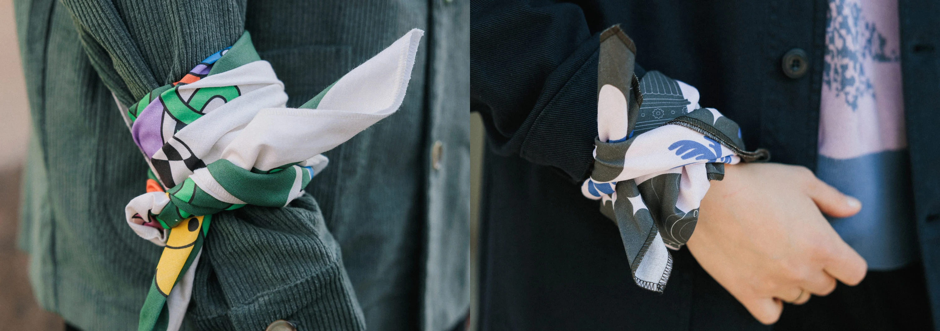 Ещё один простой способ — использовать бандану как деталь на сумке или кармане: достаточно просто завязать или немного выпустить край, чтобы добавить фактуры и цвета. В этом случае платок становится отличным элементом композиции, а в любой момент может быть использован по основному назначению.