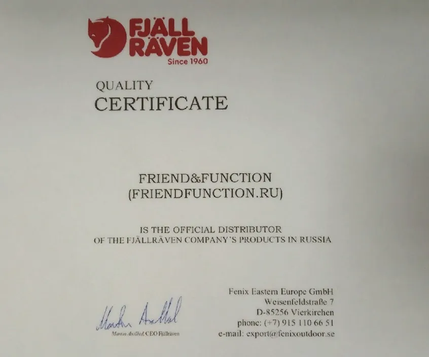 1. У Friend Function заключён официальный договор со шведской компанией Fjällräven. Вот сертификат, подтверждающий наш статус. Также мы находимся в списке официальных российских продавцов на сайте fjallraven.com.