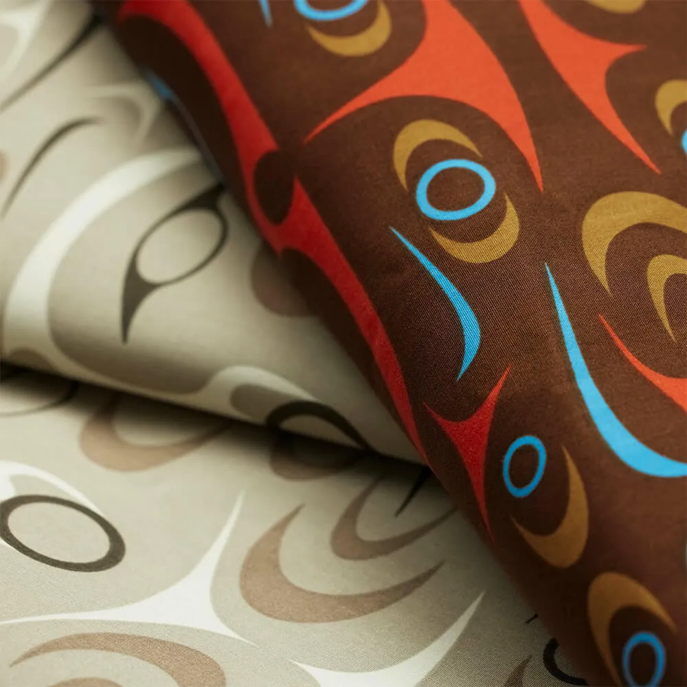 Шарлин Джонни - художница с побережья Салиш из племени Кув'утсун в Дункане, Британская Колумбия, которая работает в различных техниках, исследуя и выражая искусство своих предков. На создание данного дизайна ее вдохновили природные формы в виде головы лосося, человеческих лиц и вязаные свитера народов ковичан.