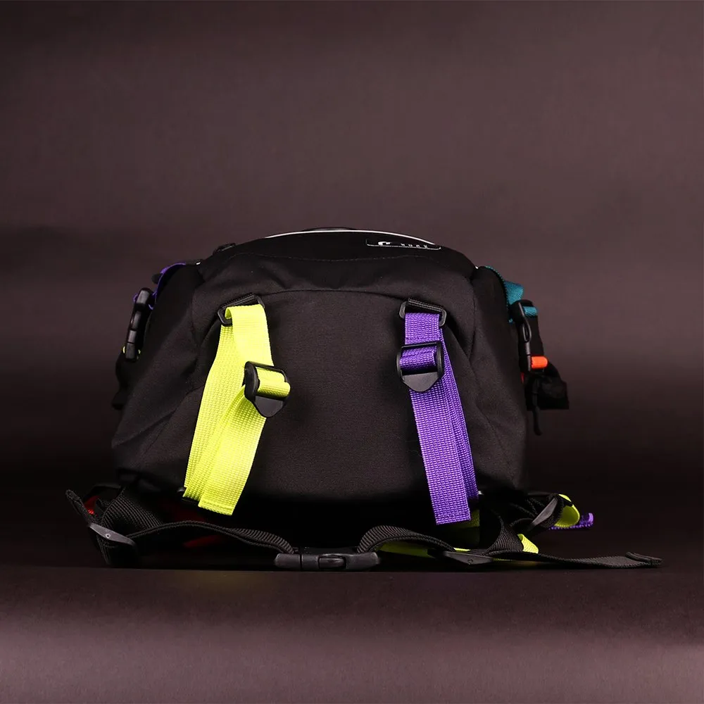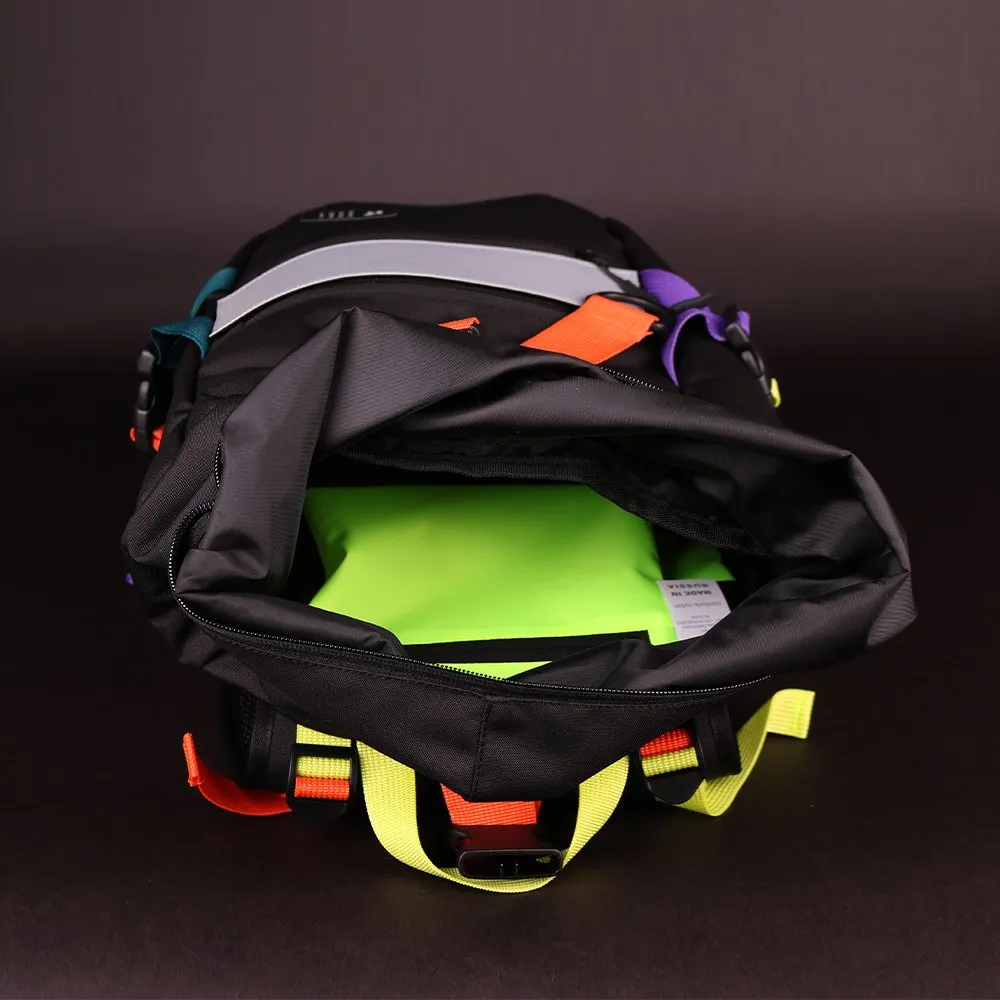 - Благодаря конструкции объем рюкзака регулируется