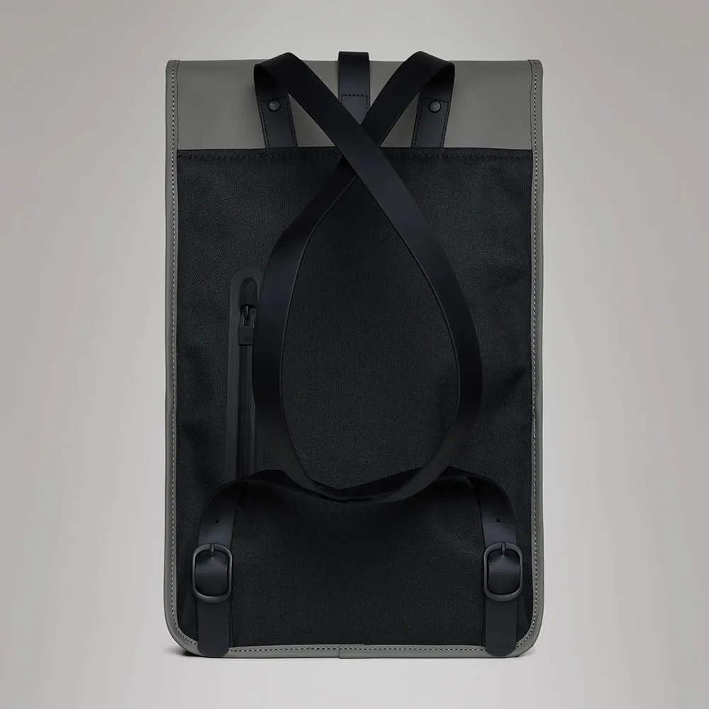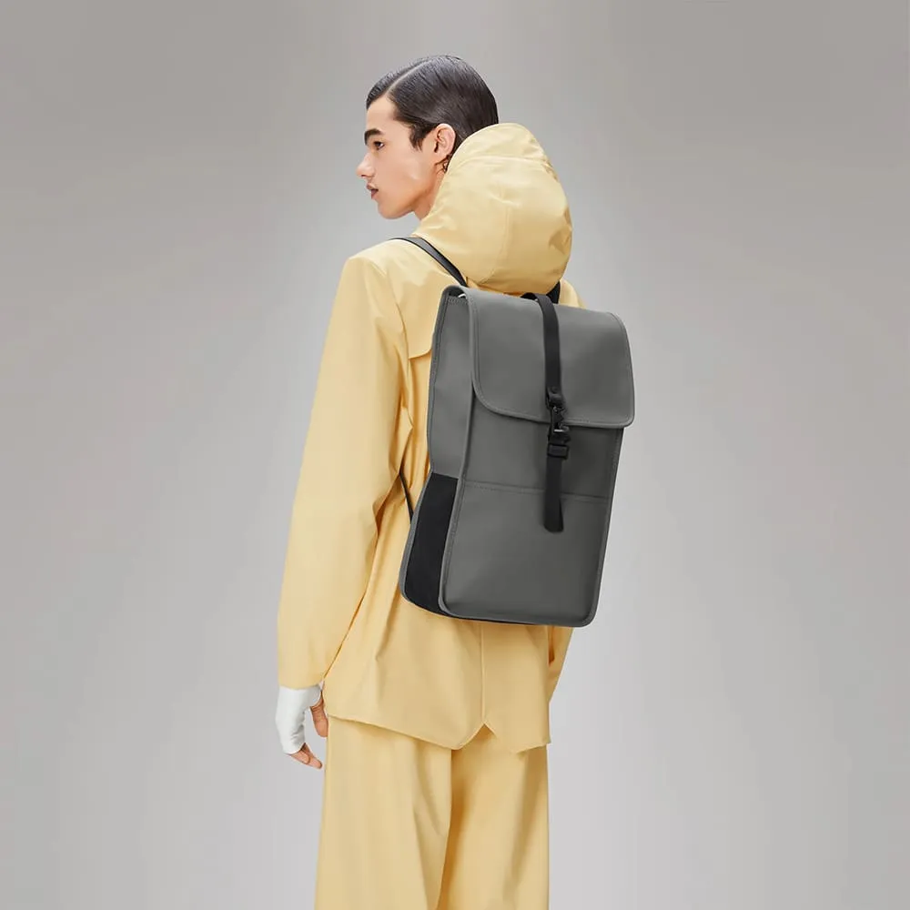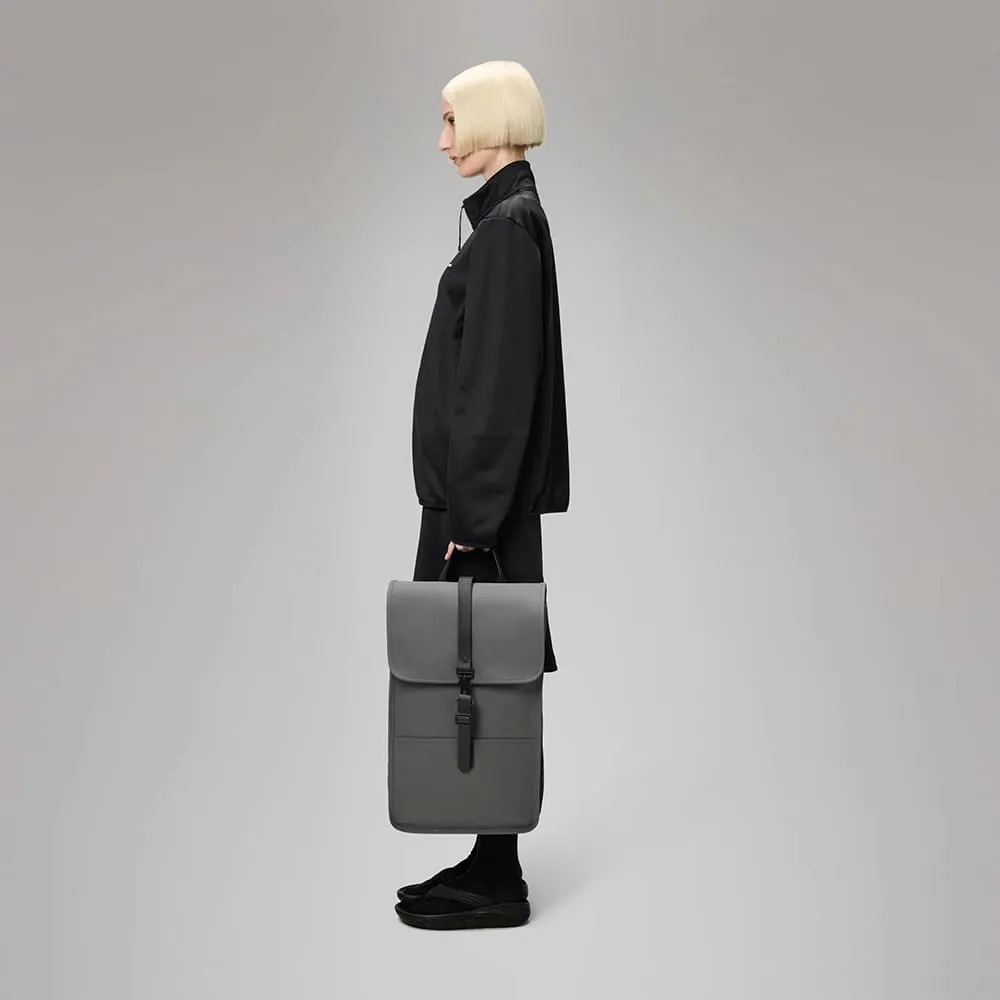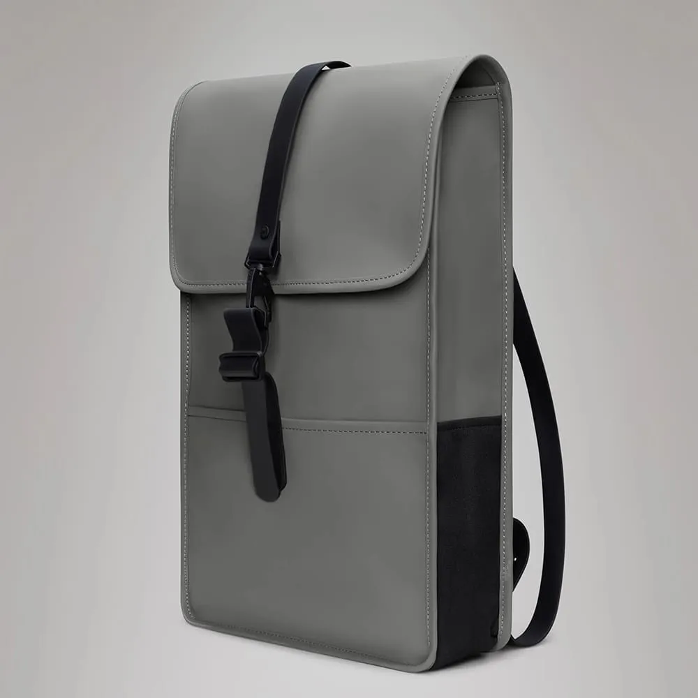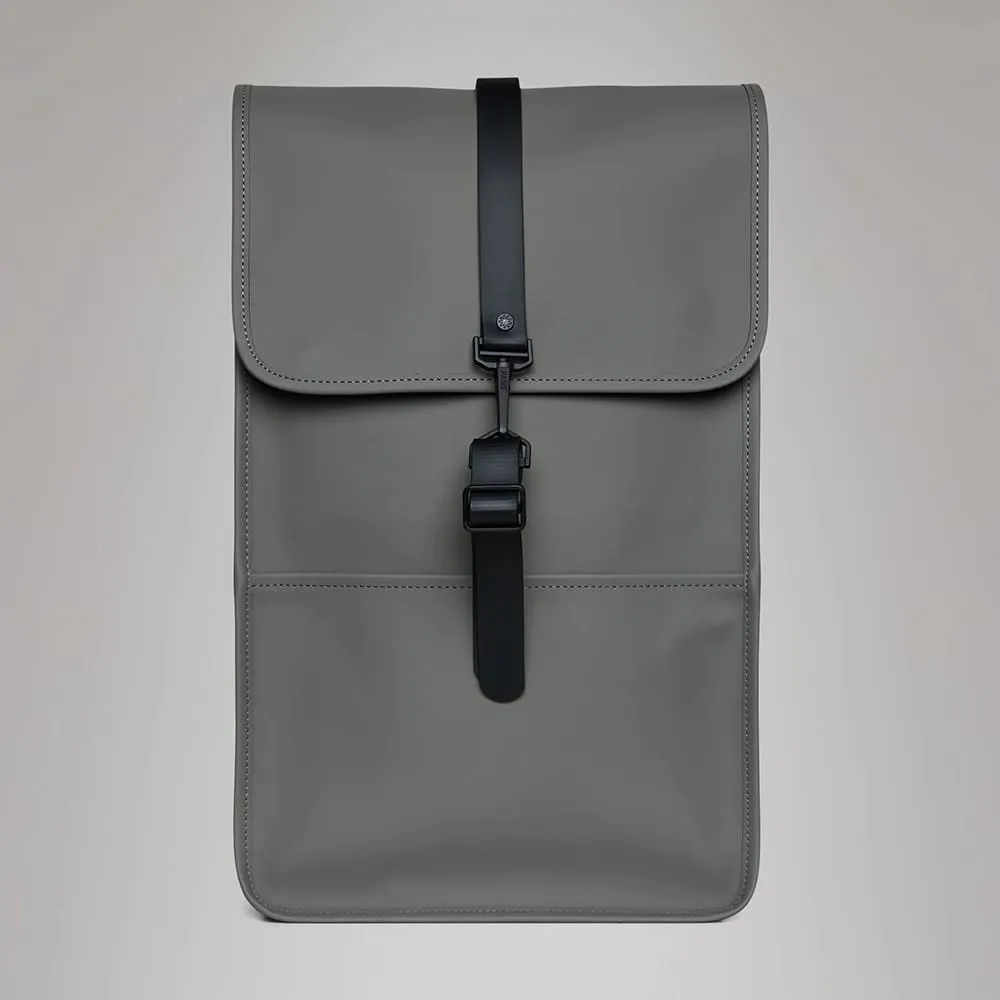 Минималистичный непромокаемый серый рюкзак Rains - это классическая форма рюкзака кейса, изготовленная из фирменной водонепроницаемой полиуретановой ткани.