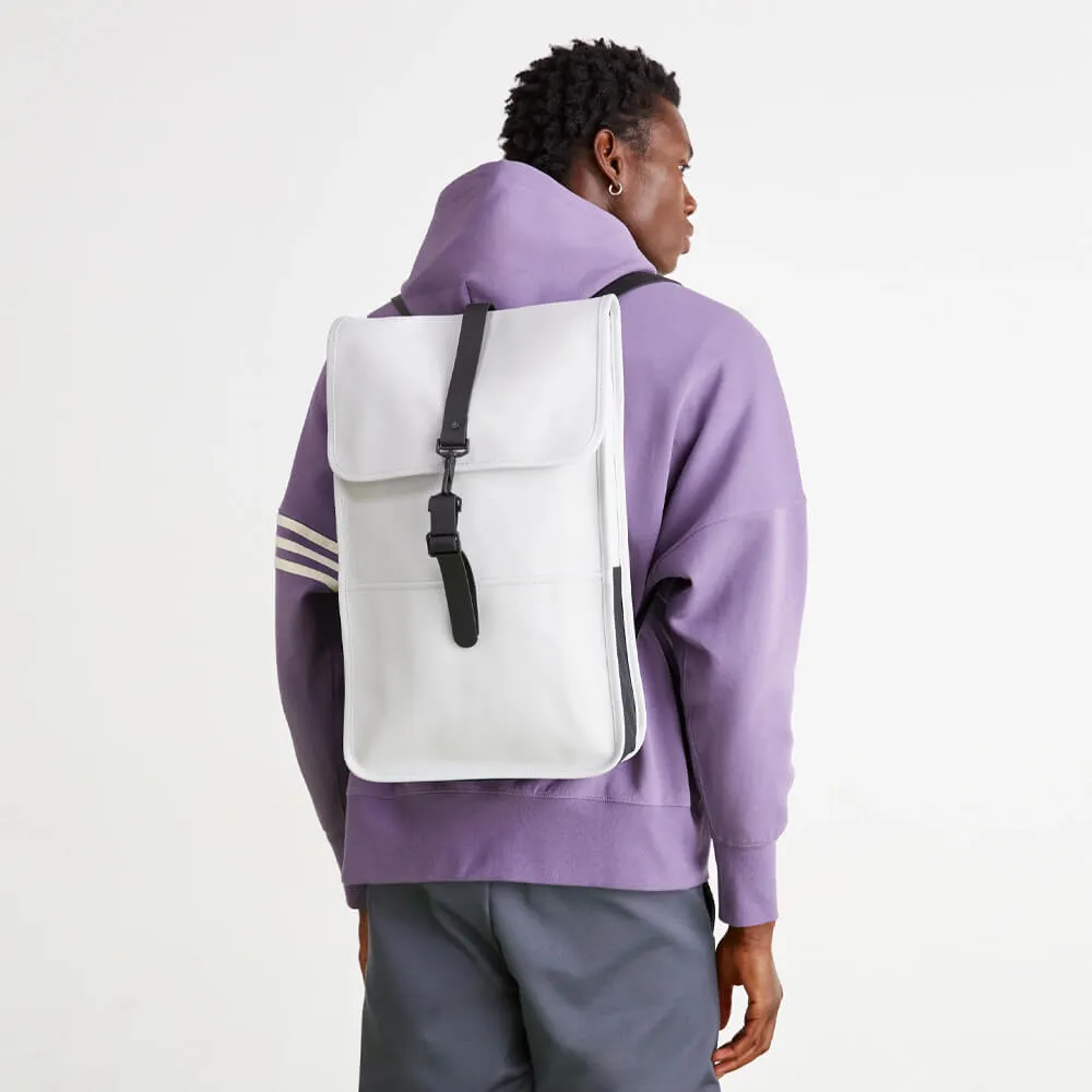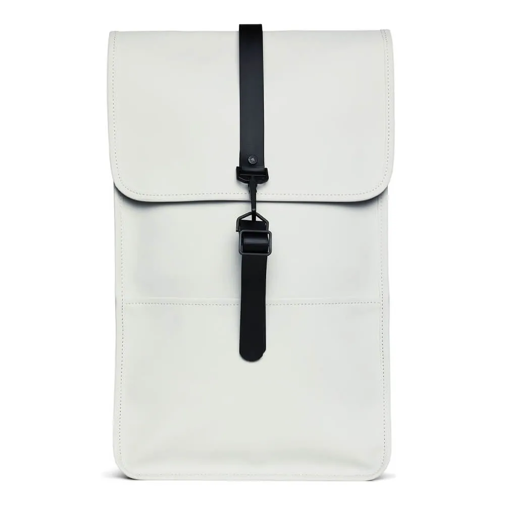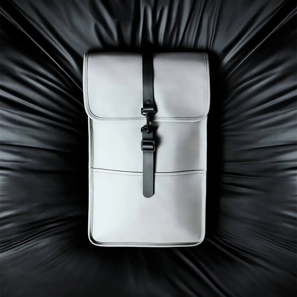 Минималистичный непромокаемый светло-серый рюкзак Rains - это классическая форма рюкзака кейса, изготовленная из фирменной водонепроницаемой полиуретановой ткани.