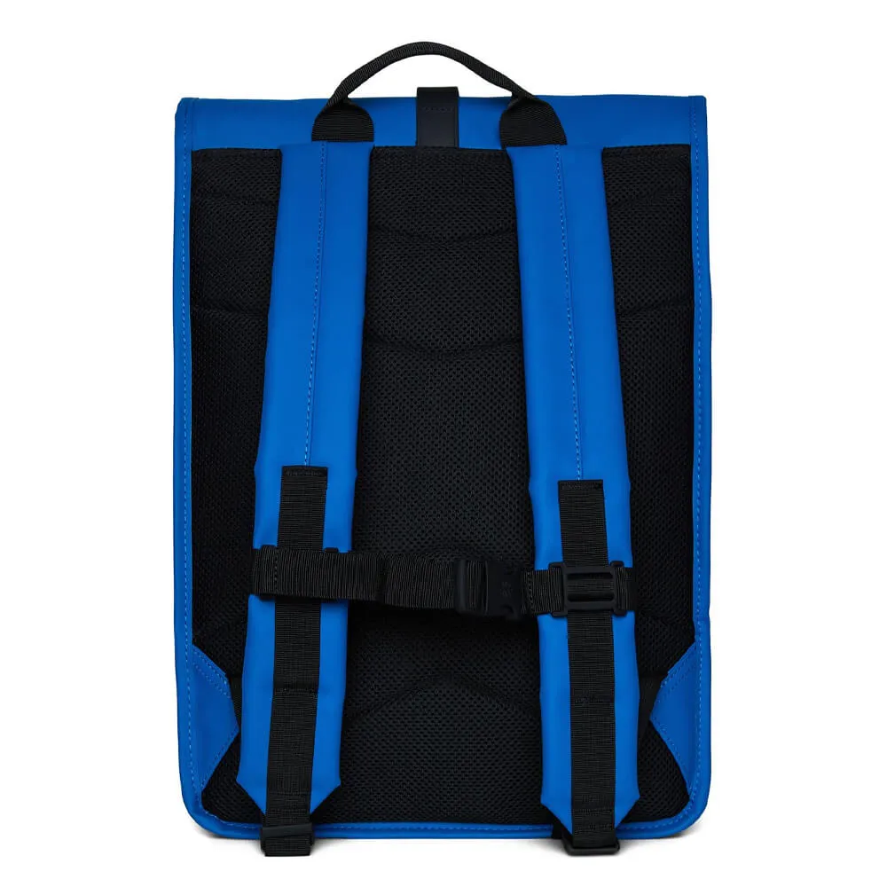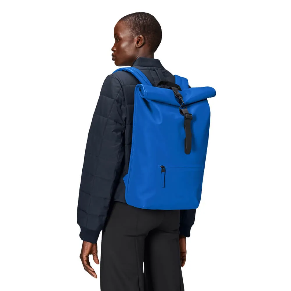 Минималистичный непромокаемый синий роллтоп рюкзак Rains идеально подходит для активной жизни в городе, поездок на велосипеде и пеших прогулок. Для велосипедистов спереди предусмотрена D-образная петля под ремешком с карабином, чтобы закрепить велосипедный замок, а регулируемый нагрудный ремень, обеспечит надежную посадку.