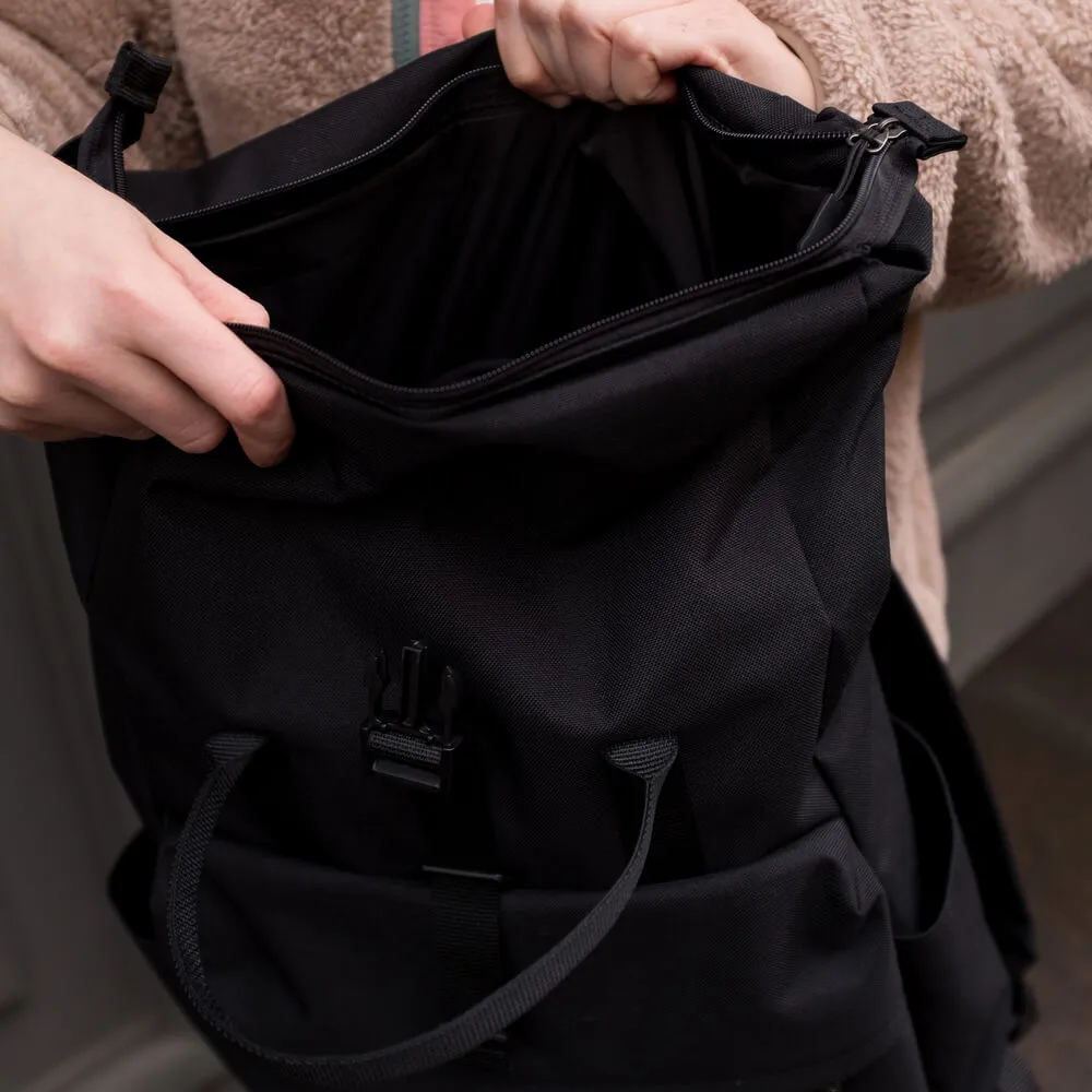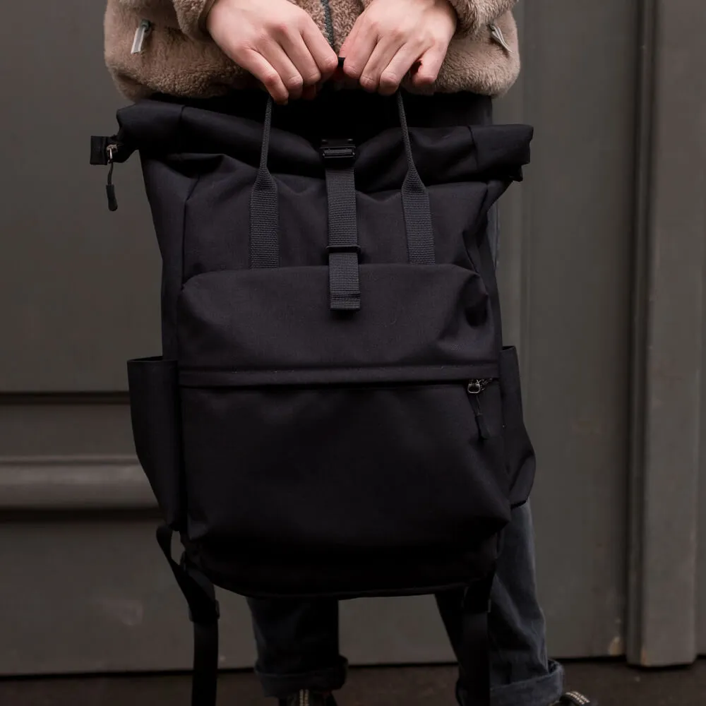 Рюкзак-роллтоп с красивым сочетанием черного цвета и черного цвета из очень прочной кордуры.