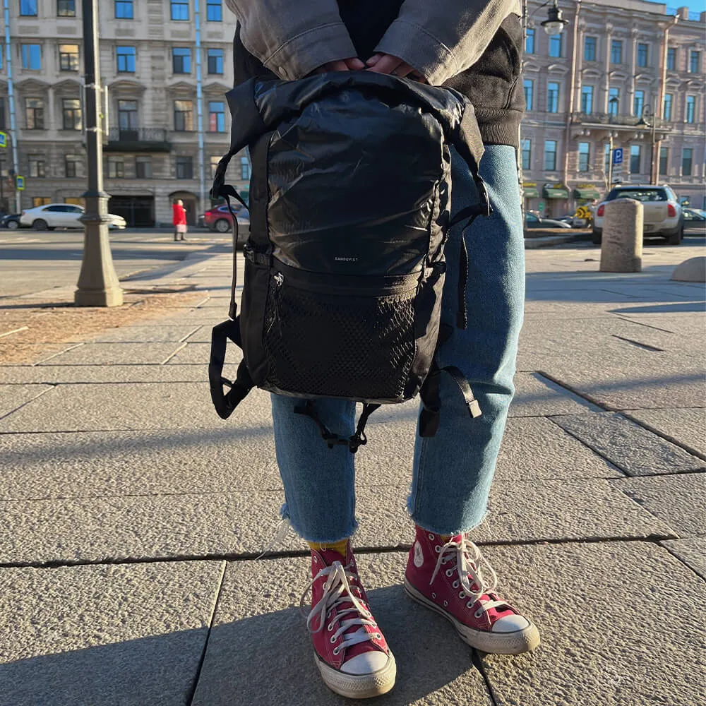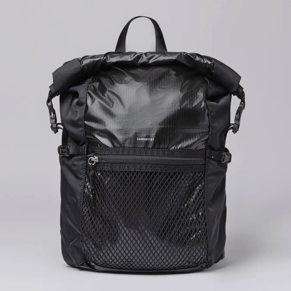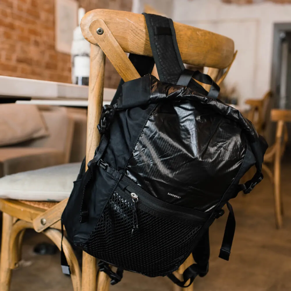 Черный роллтоп для бега Noa из серии Lightweight шведского бренда Sandqvist изготовлен из 100% переработанного нейлона рипстоп.