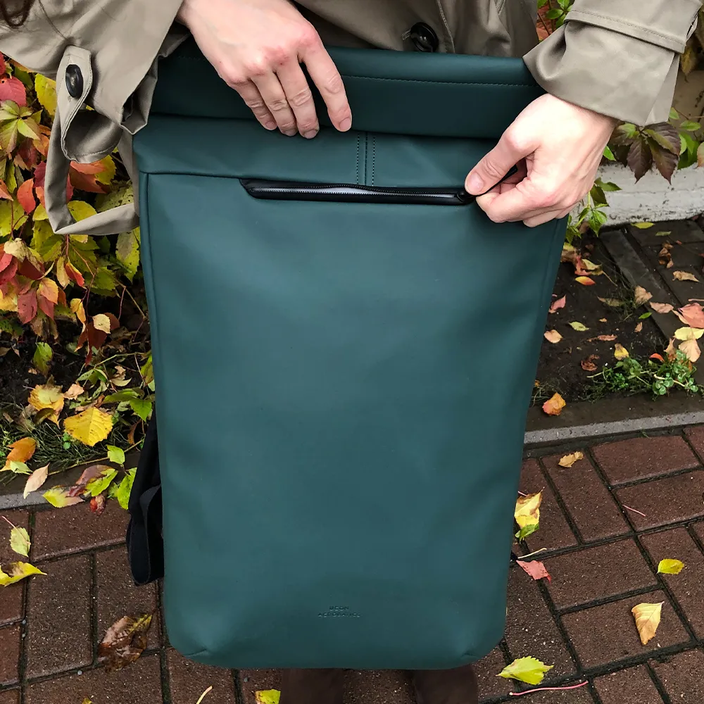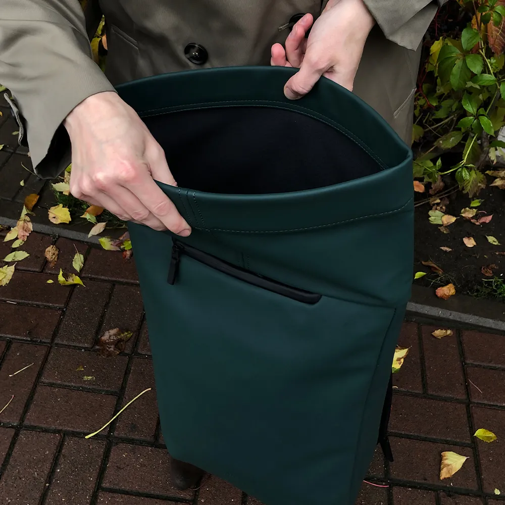 - Внешний карман на молнии, скрытый под ролл-топ частью.