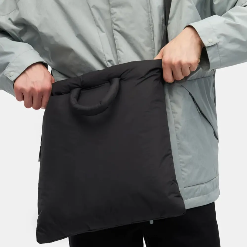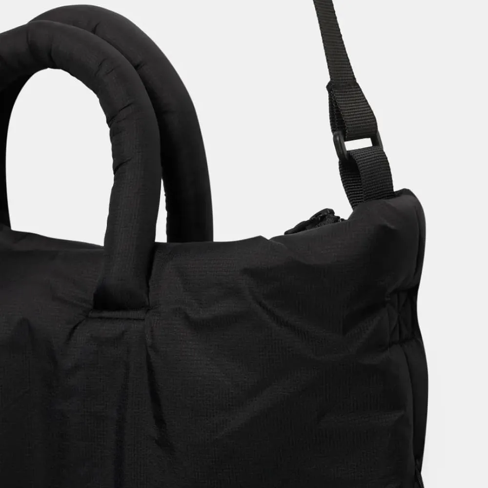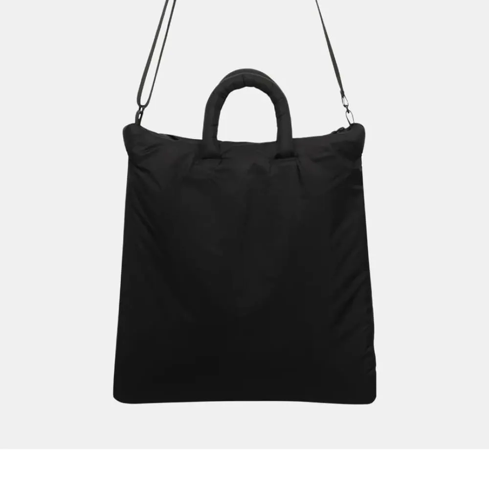 Шоппер из мембранной ткани с утеплителем. Модель с внешним карманом на молнии, дополнительным отделением на кнопке внутри, мягкими ручками и регулируемым ремнем.