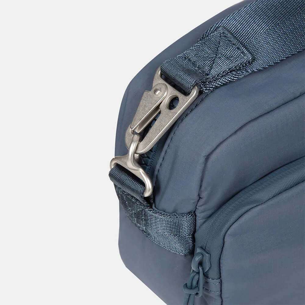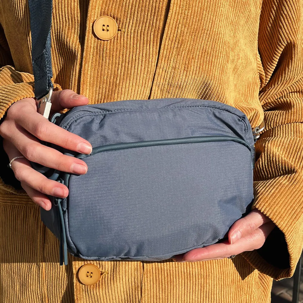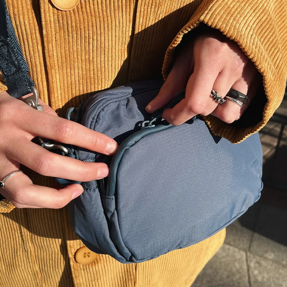 Универсальная небольшая темно-синяя сумка SHU для города и путешествий сделана из непромокаемой мембранной ткани.