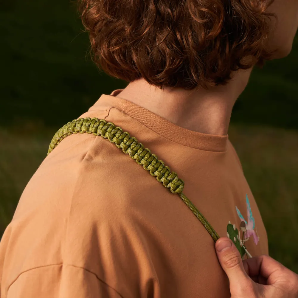 - Шнур-ручка, сплетенный вручную из профессионального паракорда, легко регулируется по длине одним движением руки