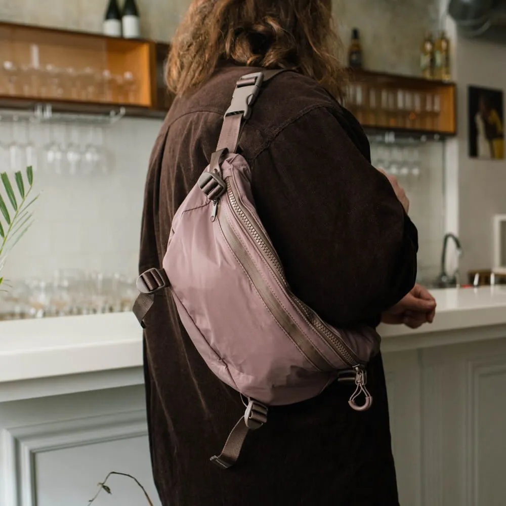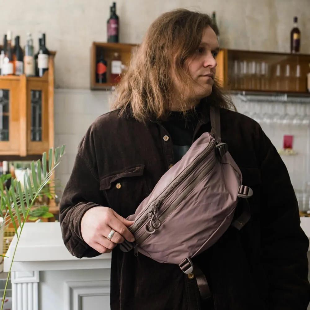 - Широкий регулируемый ремень позволяет носить сумку на поясе или на плече.
