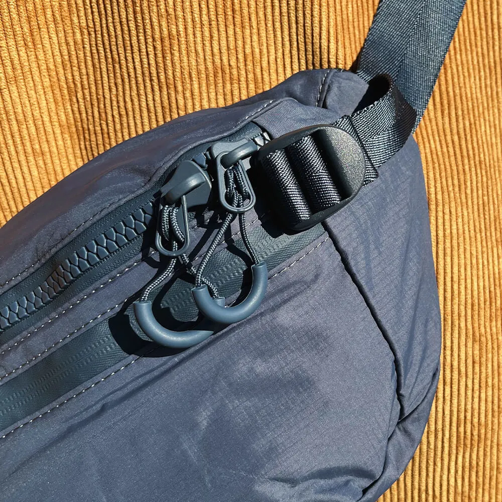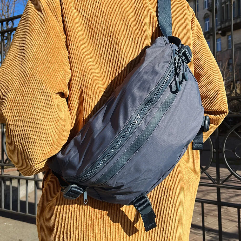 - Широкий регулируемый ремень позволяет носить сумку на поясе или на плече.
