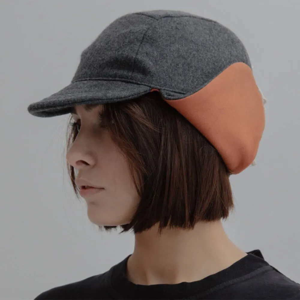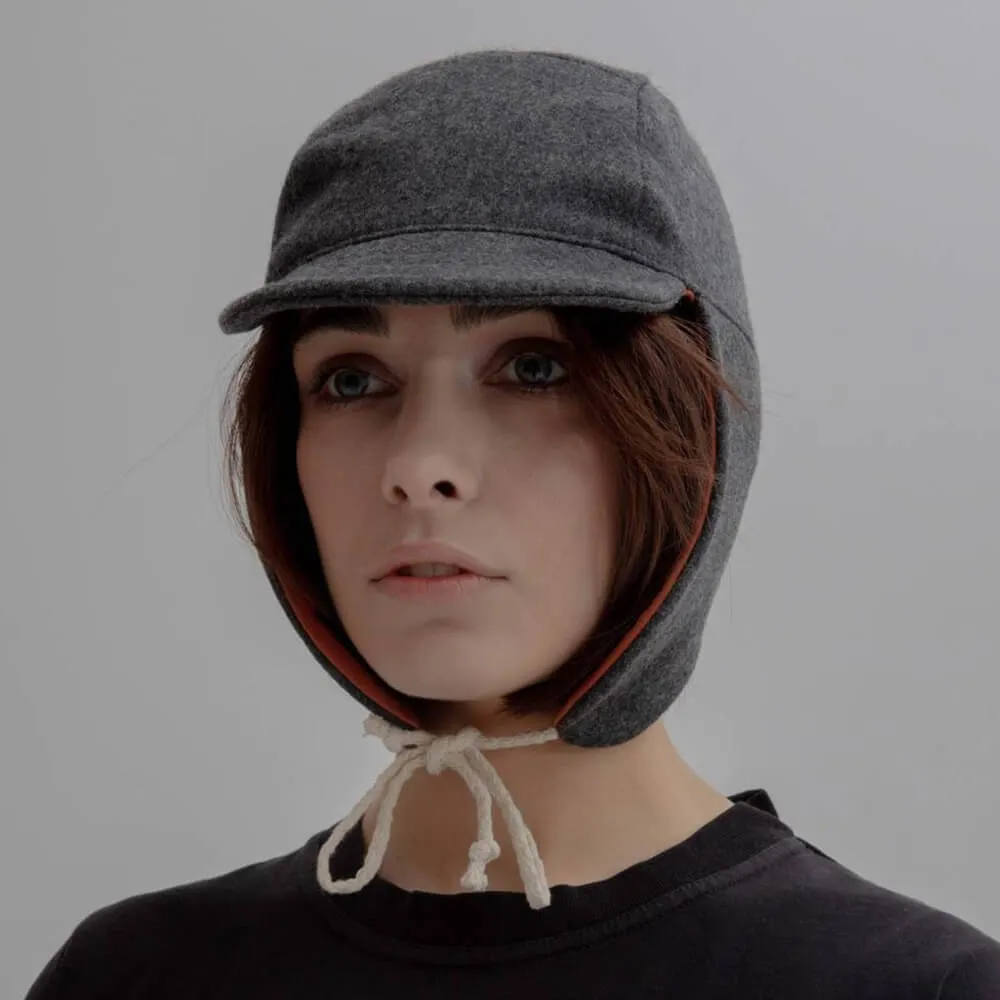 Кепка-ушанка из серого сукна с подкладкой из органического футера кирпичного цвета.