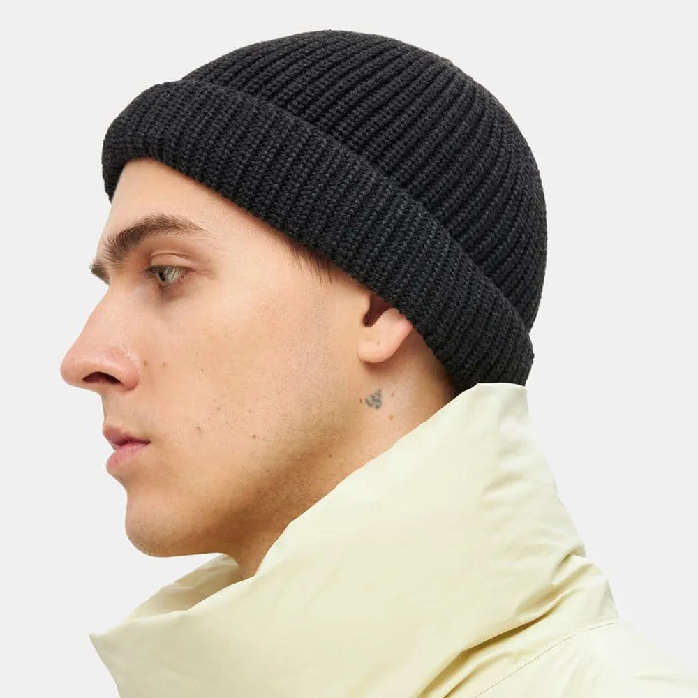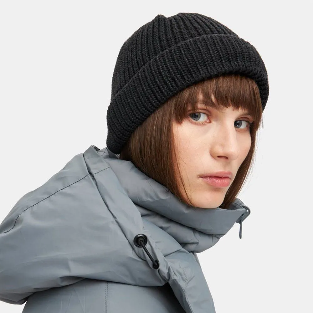 Лаконичная шапка-бини для абсолютно разных образов. Модель фактурной вязки в рубчик выполнена из акрила и шерсти, что делает ее эластичной и теплой.