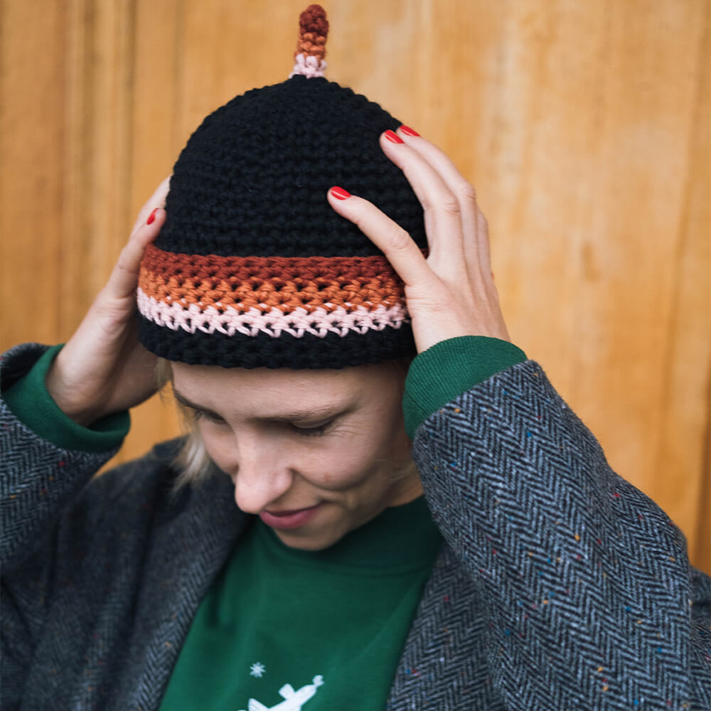 • Однослойная шапка с отворотом и хвостиком в полоску