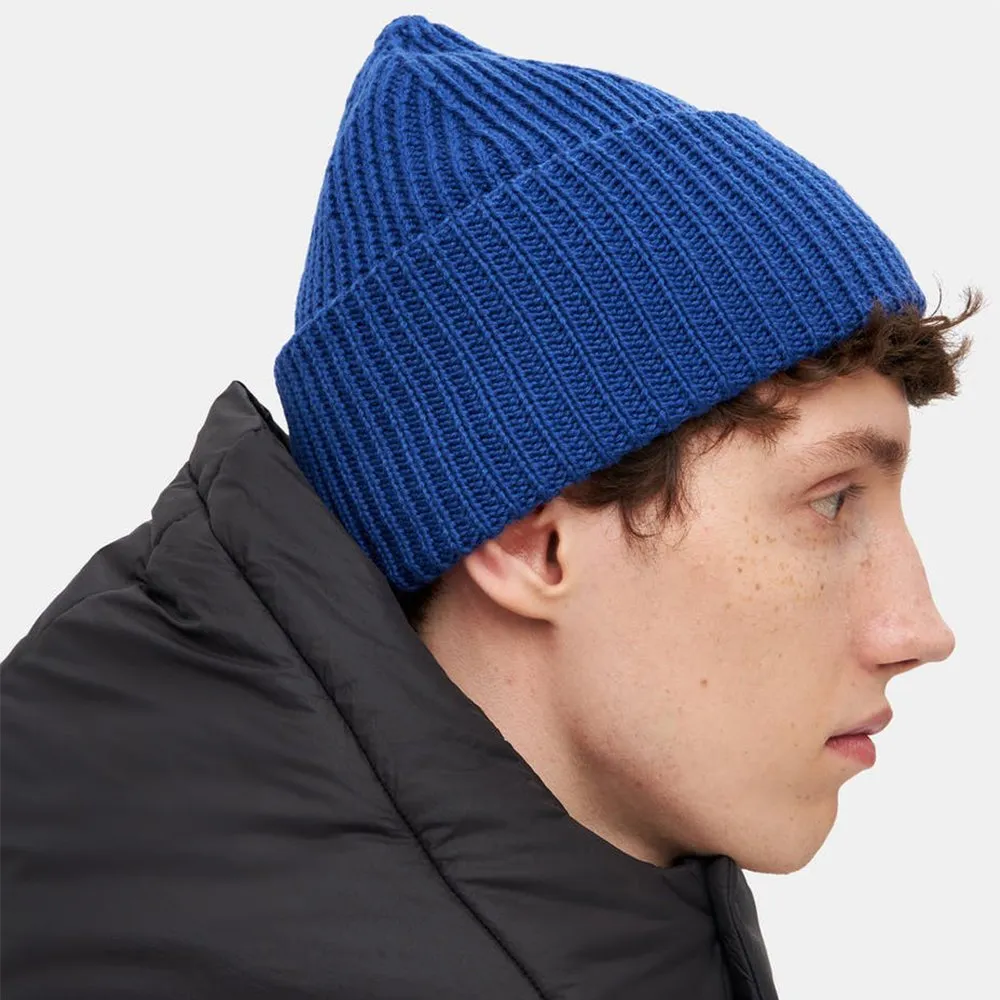 Шерстяная шапка фактурной вязки в рубчик, что обеспечивает плотное облегание и защиту от холода.