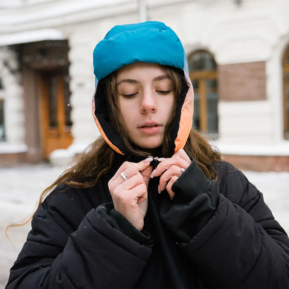 • Козырек можно отстегнуть и тогда эта часть закроет вам глаза - очень удобно, если вы решили вздремнуть на зимнем солнышке.