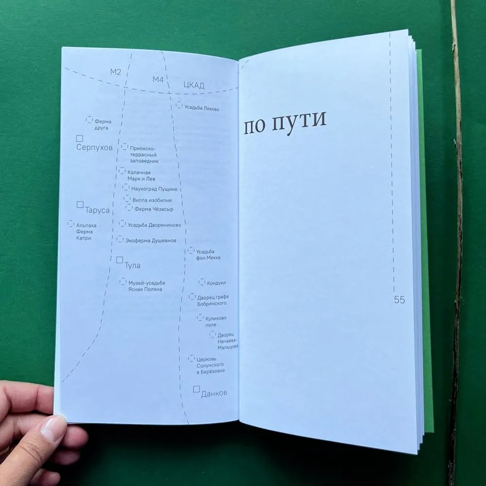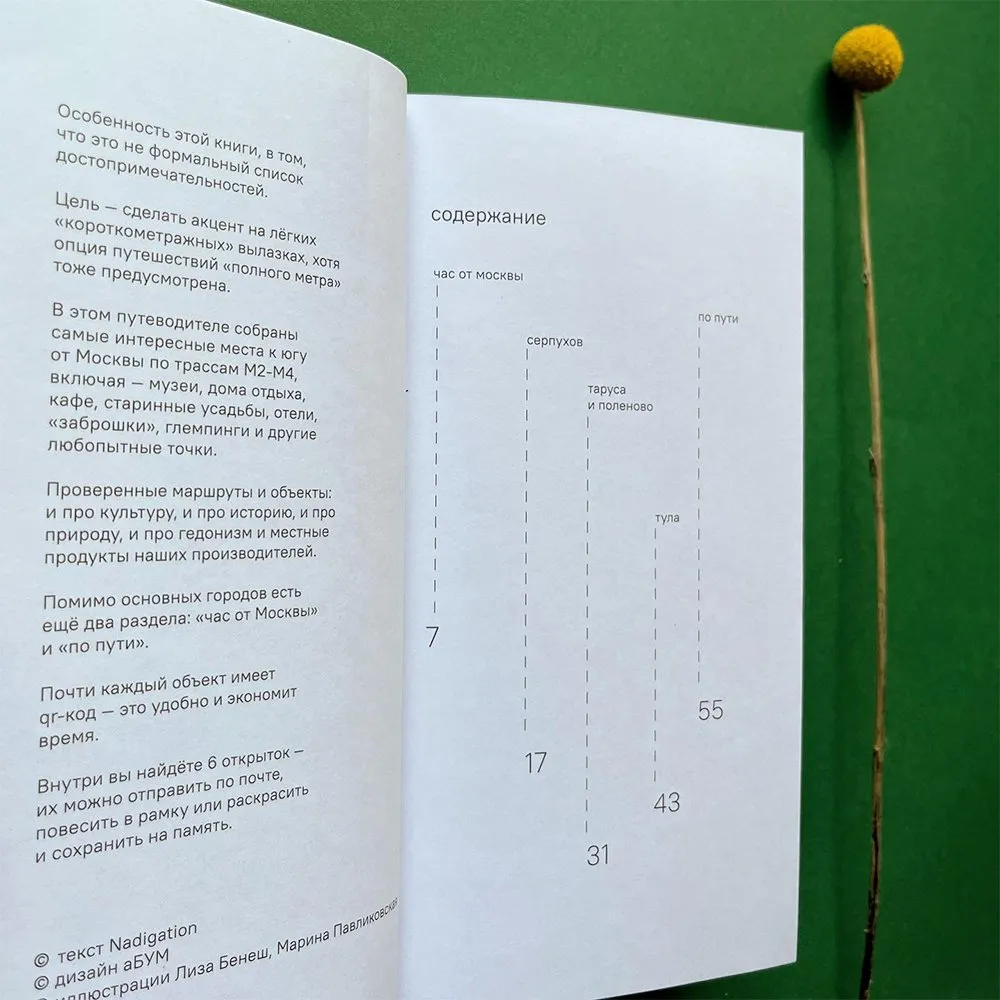 Путеводитель, в котором собраны самые интересные места направлений М2-М4 от музеев и домов отдыха до заброшек и глемпингов. Удобное расположение точек позволяет не только изучать города в формате вылазок выходного дня, но и дополнять путешествие неизвестными точками или же сформировать свое приключение из самых разных объектов Московской, Тульской и Липецкой областей. Помимо основных городов Серпухов, Тула, Таруса (Поленово) есть ещё два раздела: «час от Москвы» и «по пути».