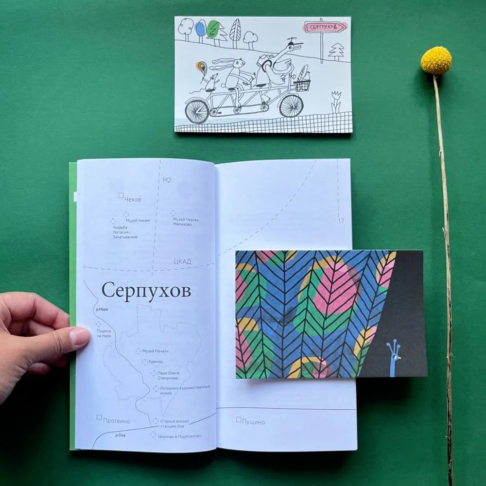 В комплекте: сам путеводитель + внутри комплект из 6 открыток ( 3 открытки с авторскими иллюстрациями по мотивам городов из путеводителя + 3 ракраски тоже по мотивам городов (можно дать в дороге детям раскрашивать).
