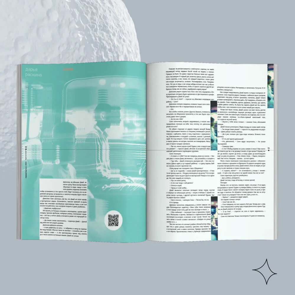 - Веер жанров, уникальное графическое оформление, 128 страниц чистой эстетики и QR-коды, открывающие двери в онлайн-библиотеку с тысячами историй.