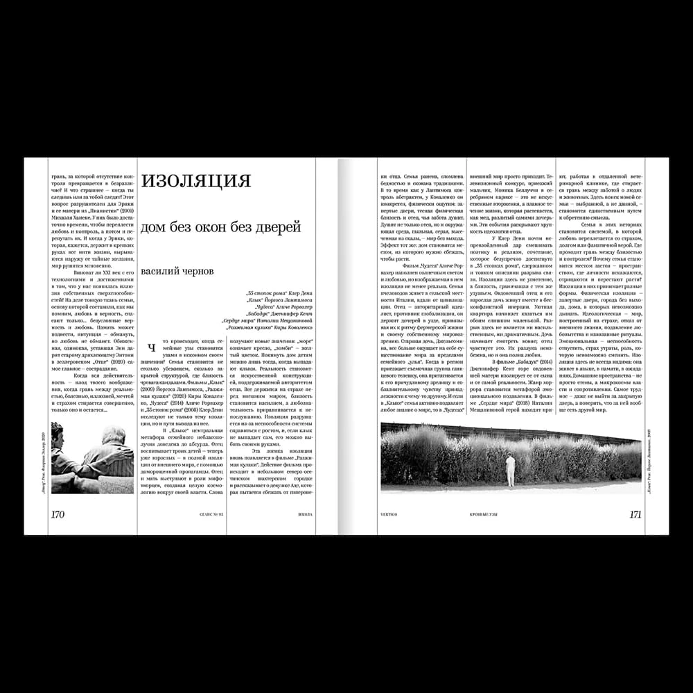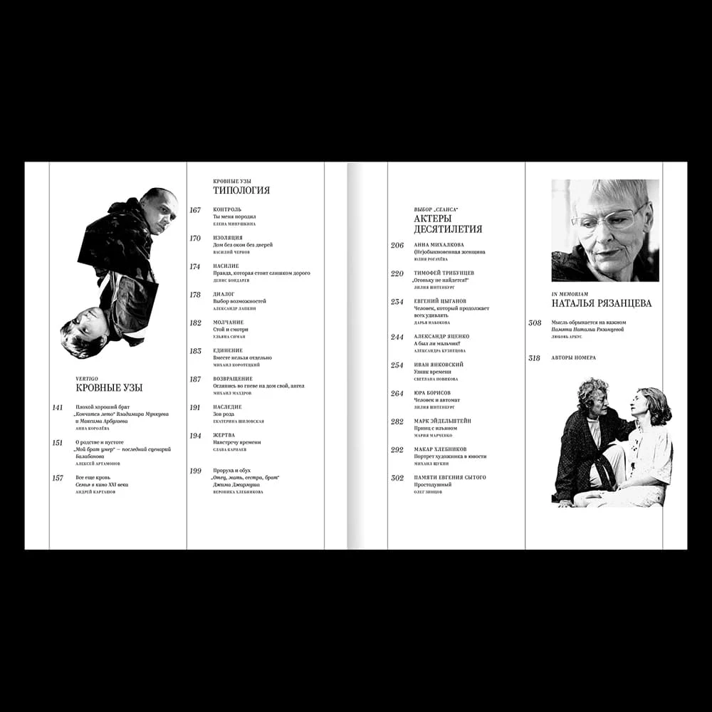 Герои этого номера: Анна Михалкова, Евгений Цыганов, Тимофей Трибунцев, Александр Яценко, Иван Янковский, Юра Борисов, Марк Эйдельштейн, Макар Хлебников, Евгений Сытый и студенты школы «Сеанс». В финале номера — In Memoriam: вспоминаем о Наталье Рязанцевой, покинувшей нас три года назад.