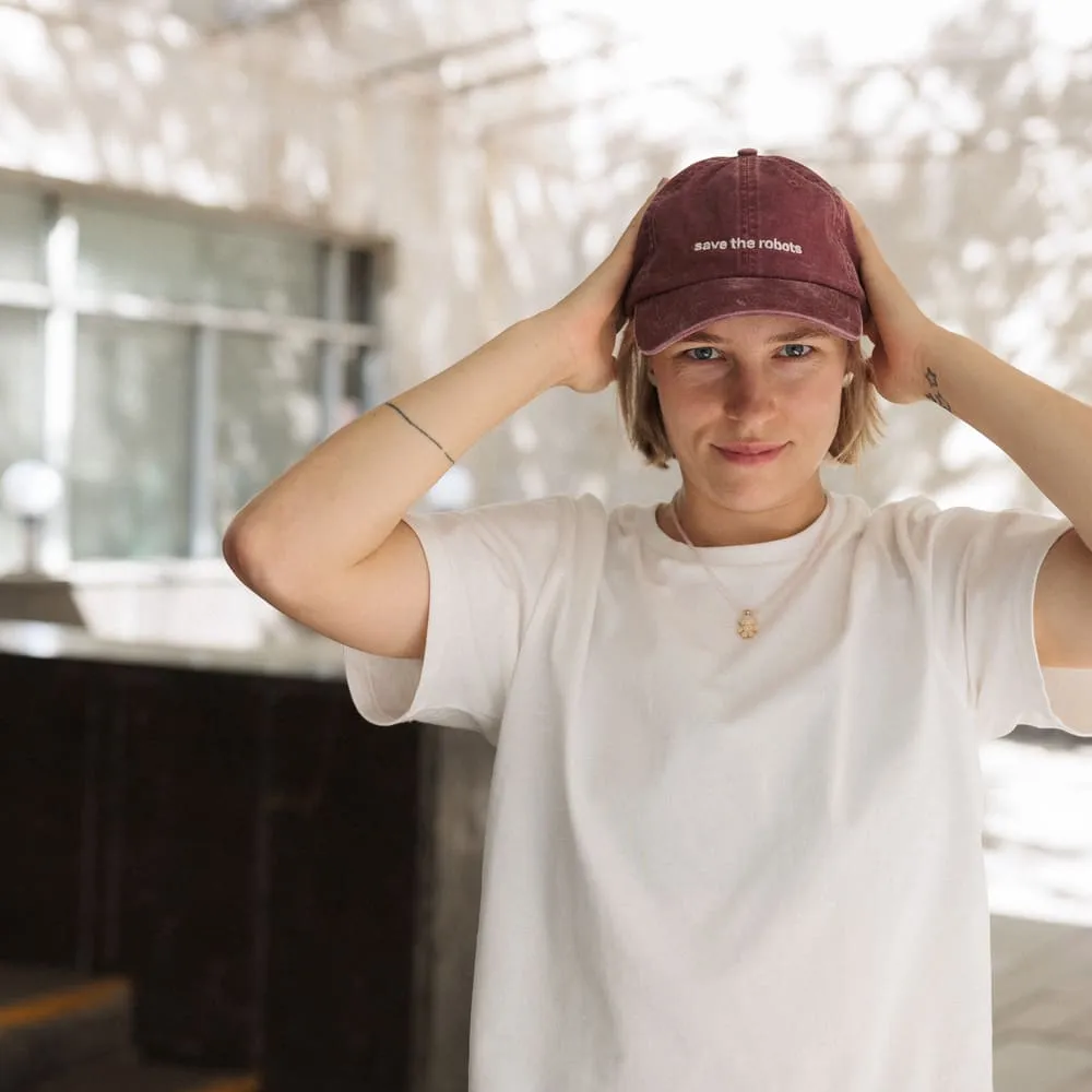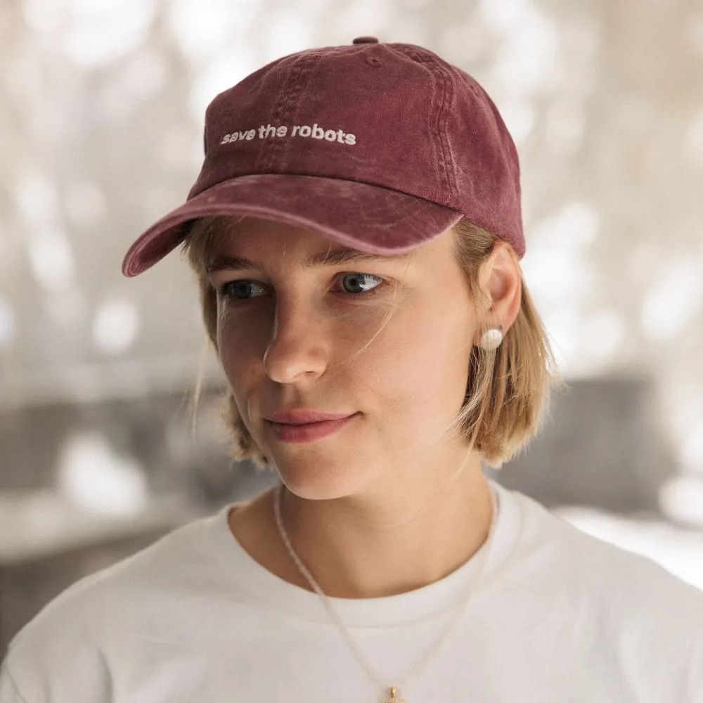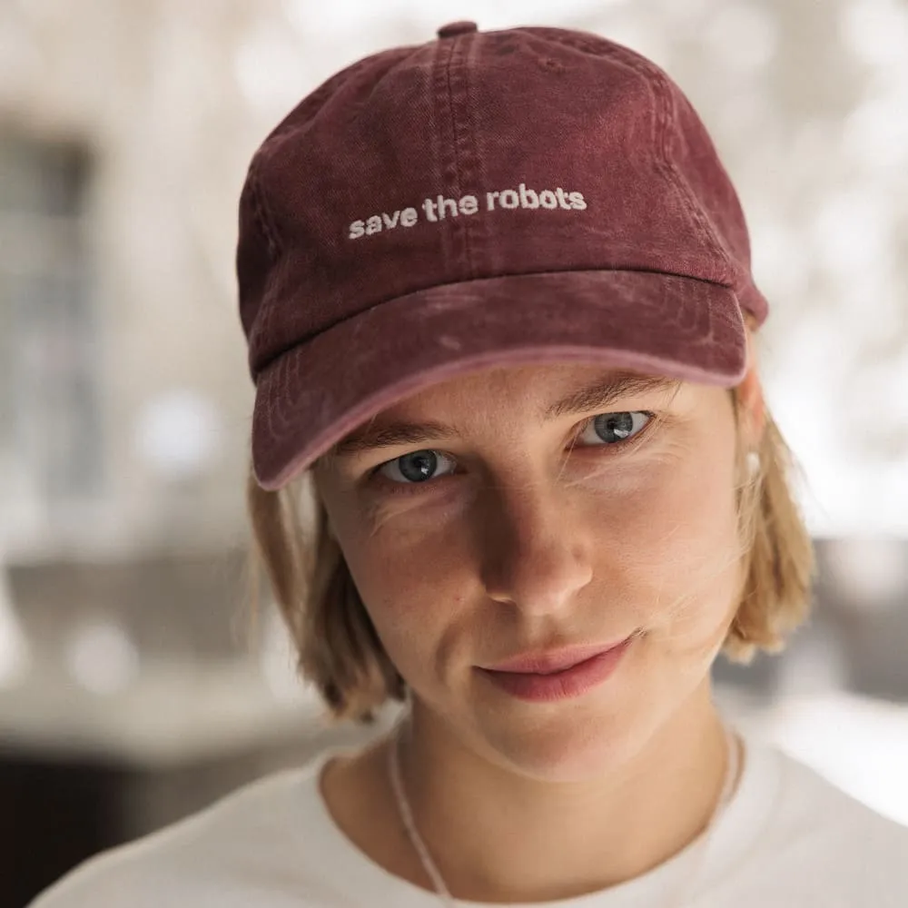 Классная добрая кепка с вышивкой светонакопительной нитью "save the robots" (светится в темноте).