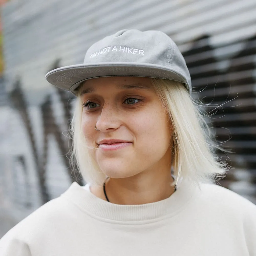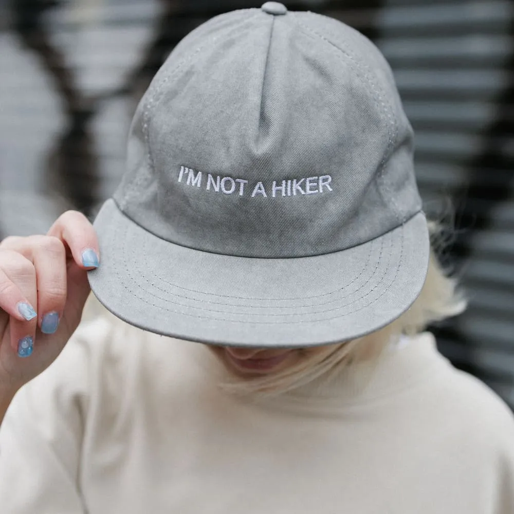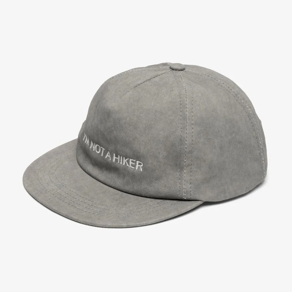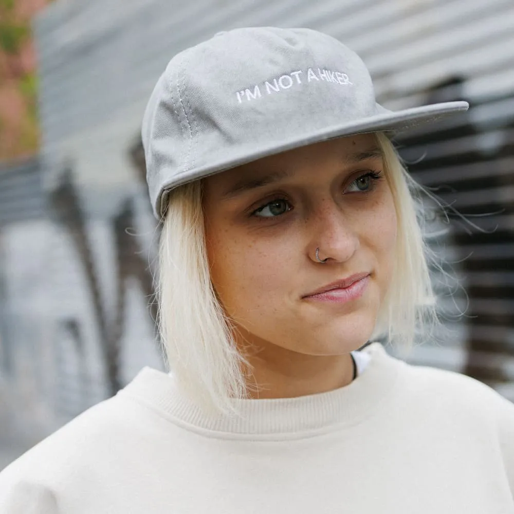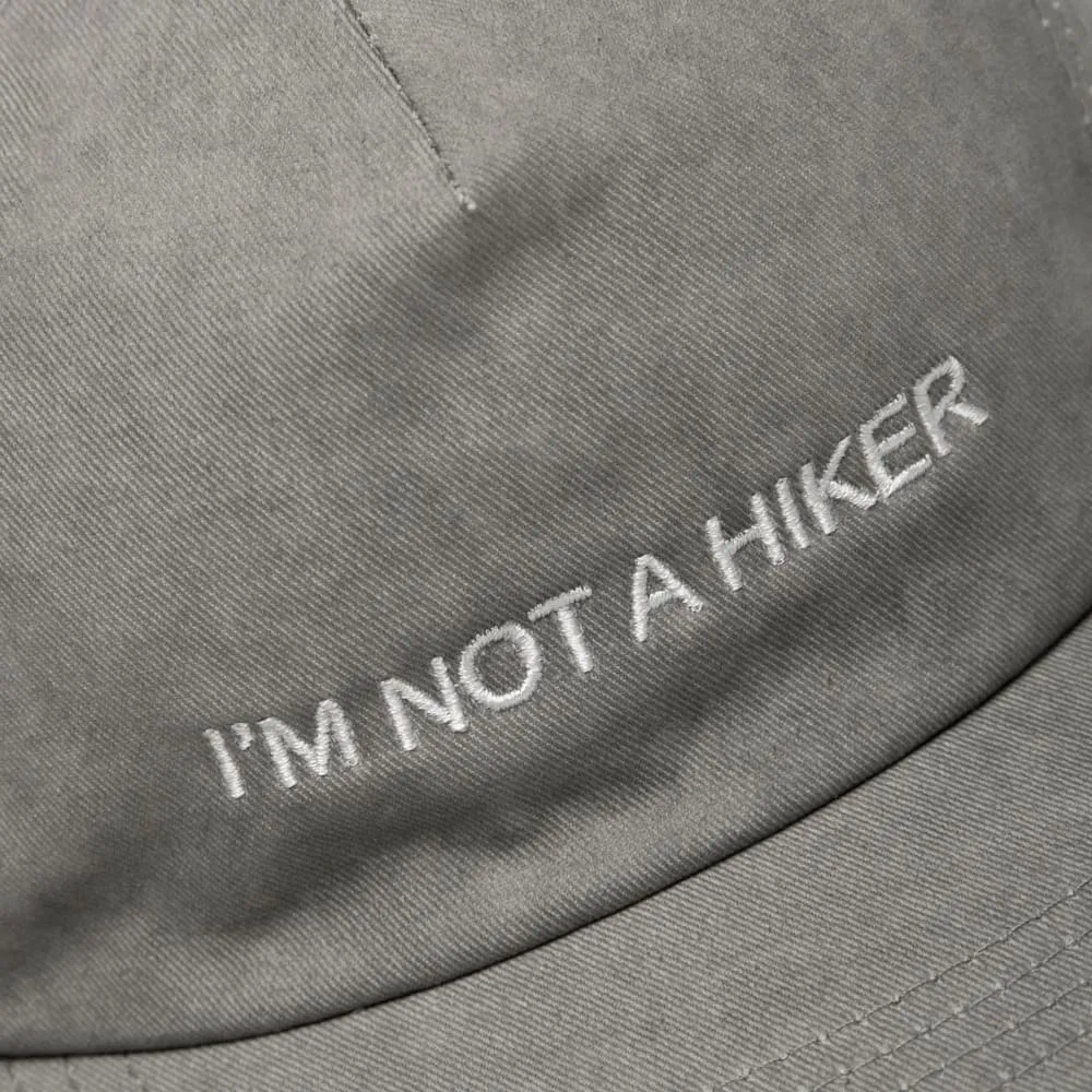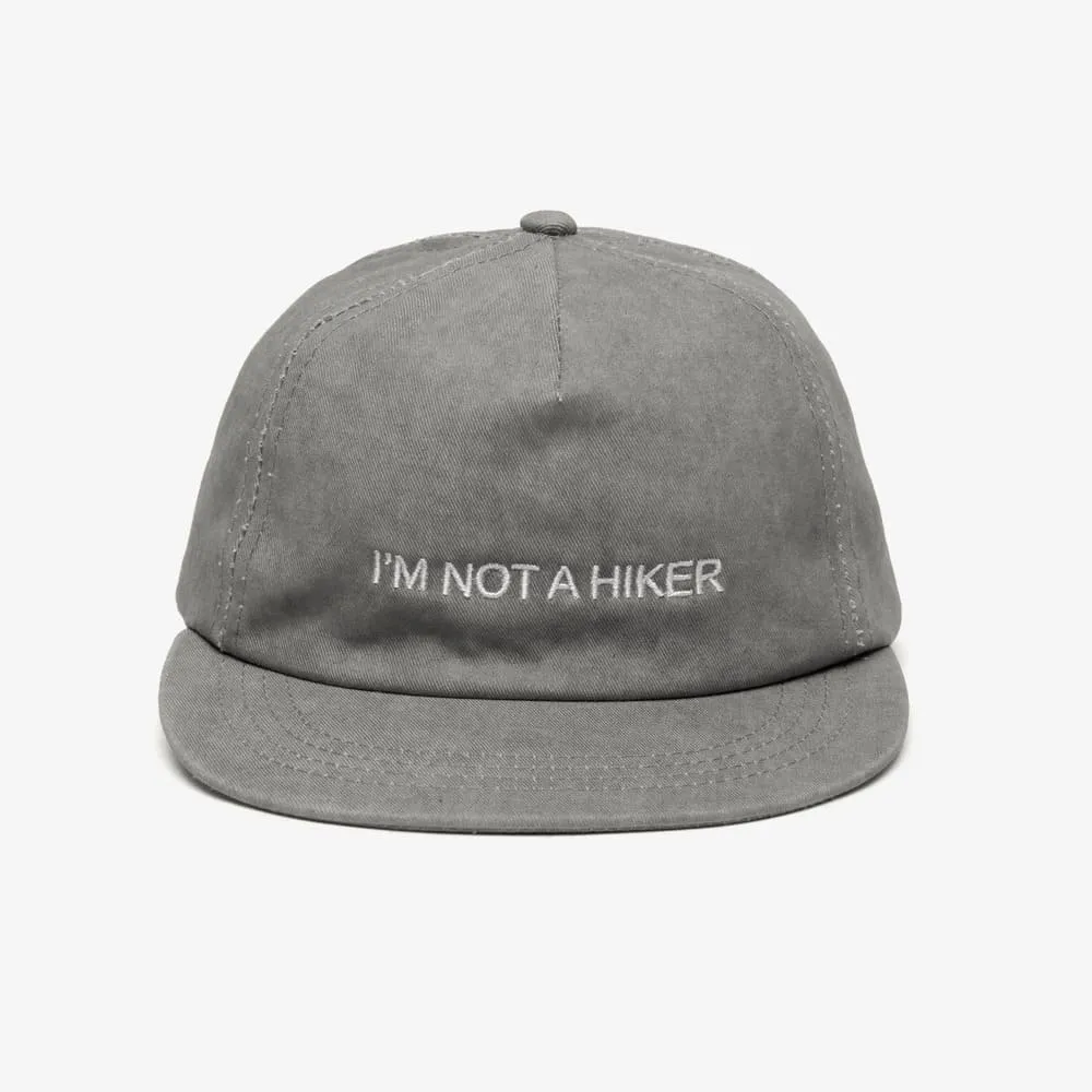 Классная базовая кепка с прямым козырьком и регулируемым ремешком. Сделана из плотного хлопка, предварительно окрашенного — за счёт этого ткань получила уникальный оттенок с лёгким градиентом. Спереди – надпись "I'm not a hiker", чтобы никто случайно не перепутал.