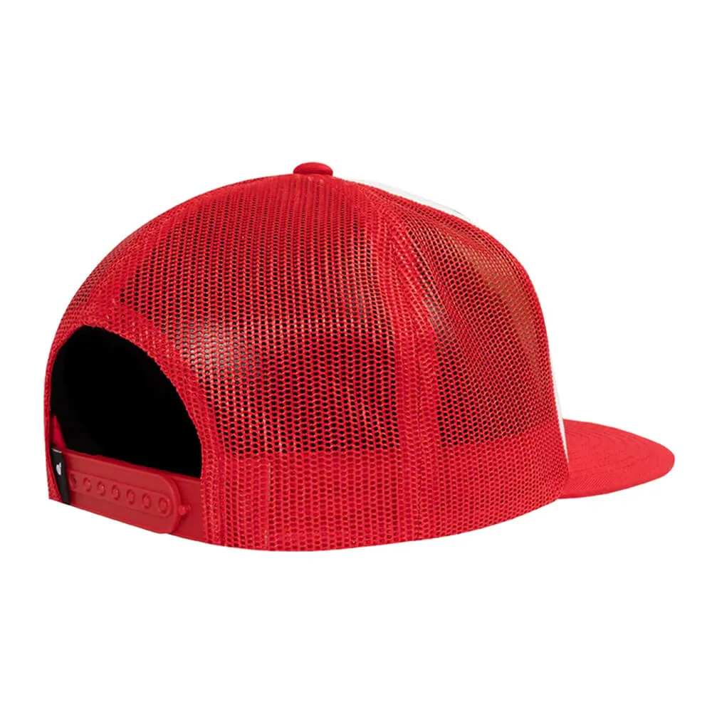 Классическая красно-белая кепка с прямым козырьком и сеткой сзади.