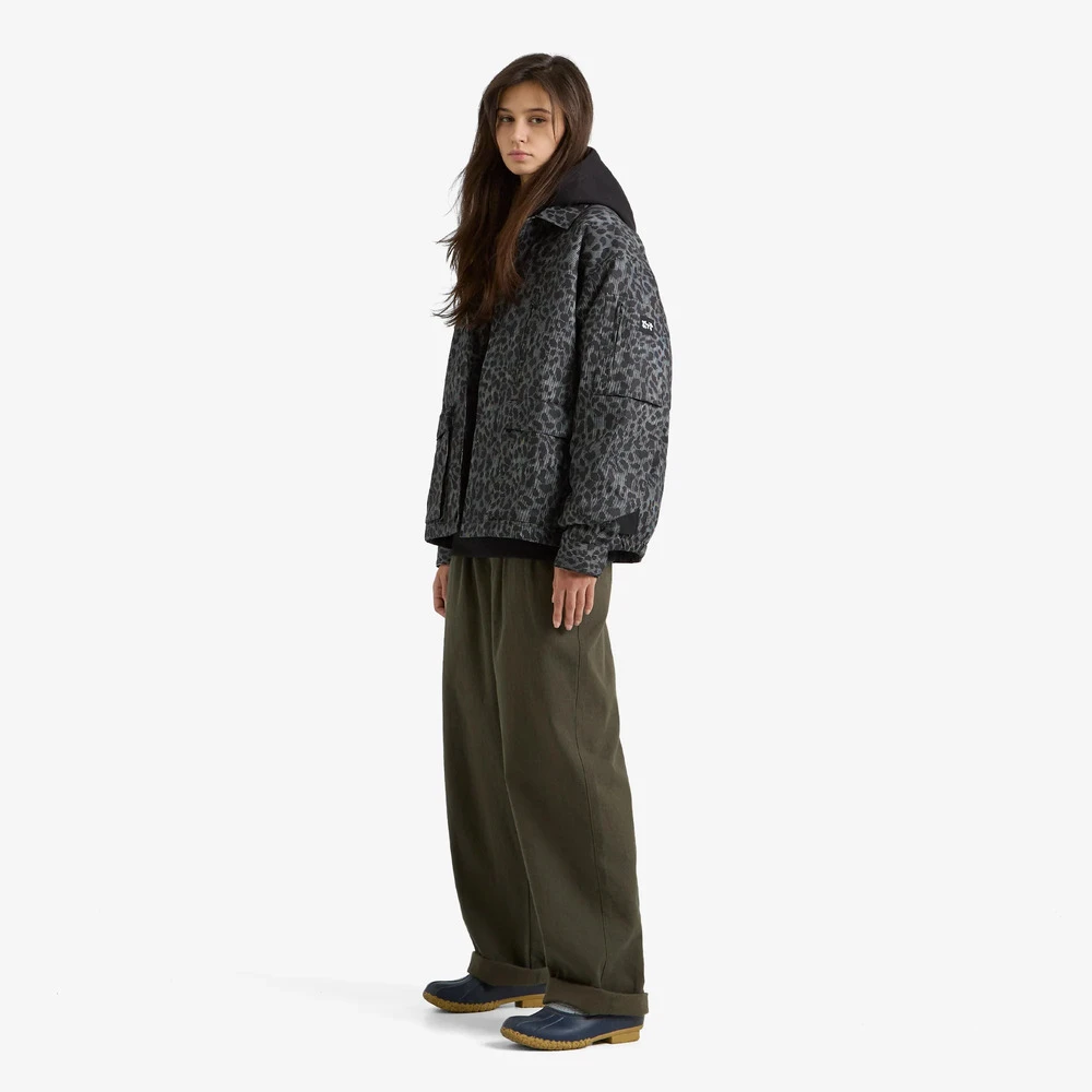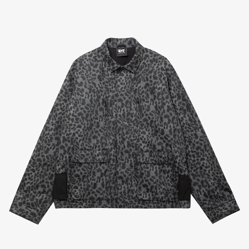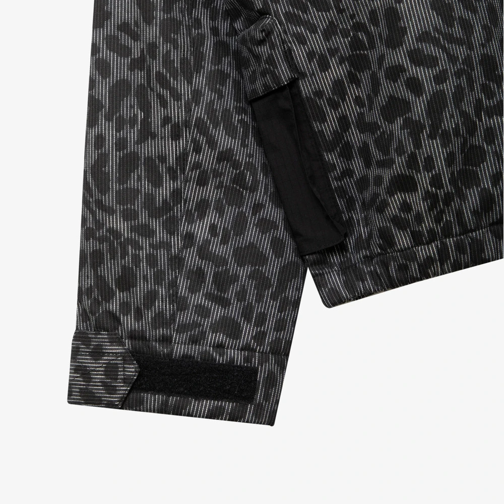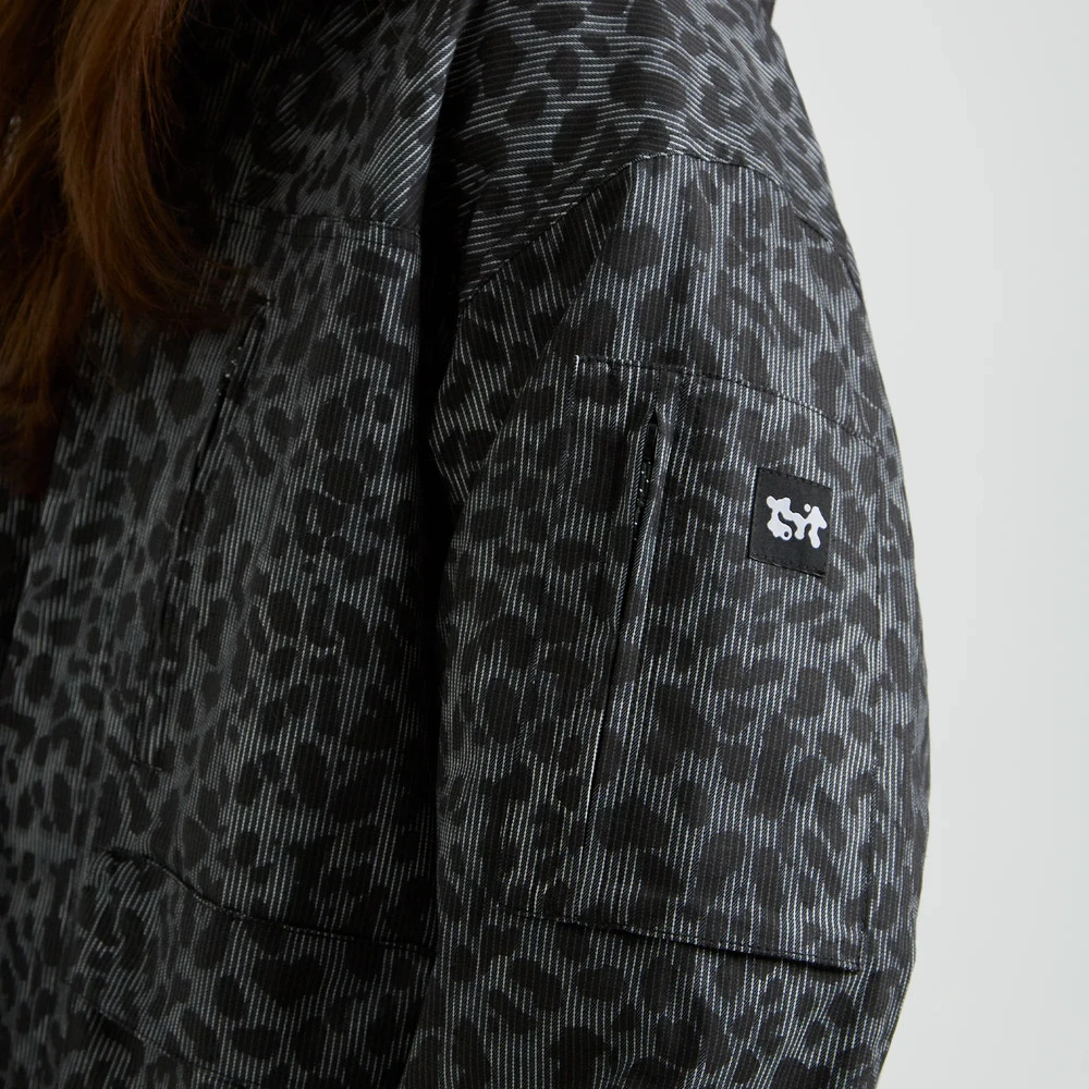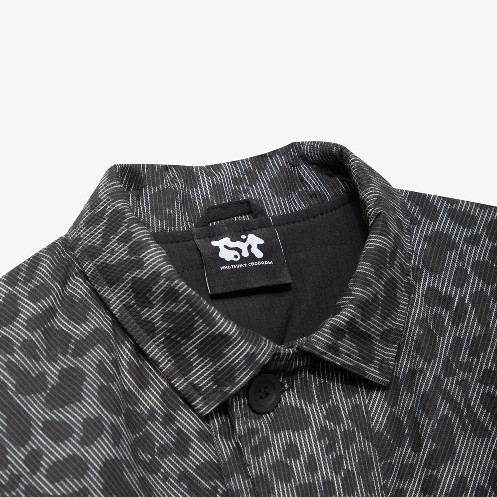 Внешняя сторона куртки сделана из хлопковой ткани с необычным узором, сочетающим в себе вертикальную полоску и леопардовый паттерн.