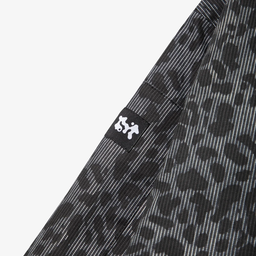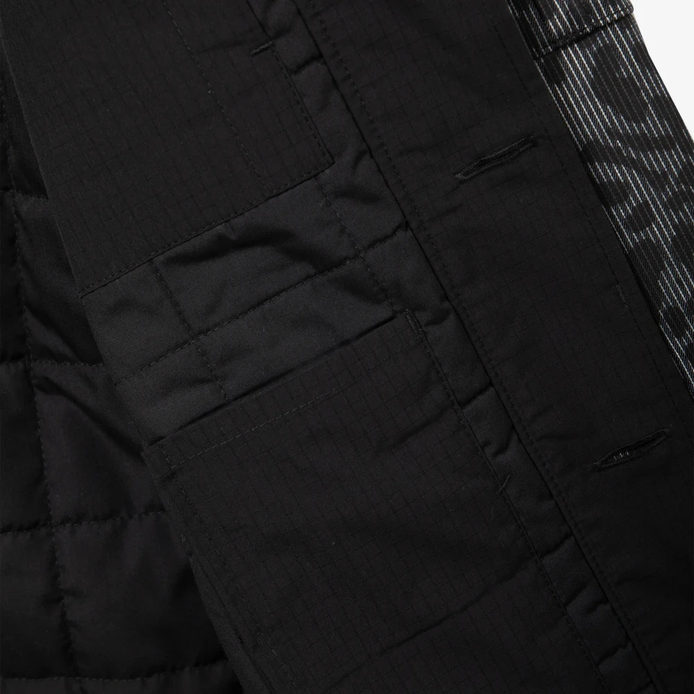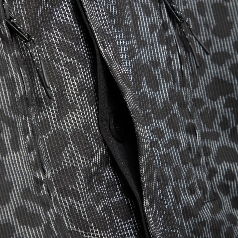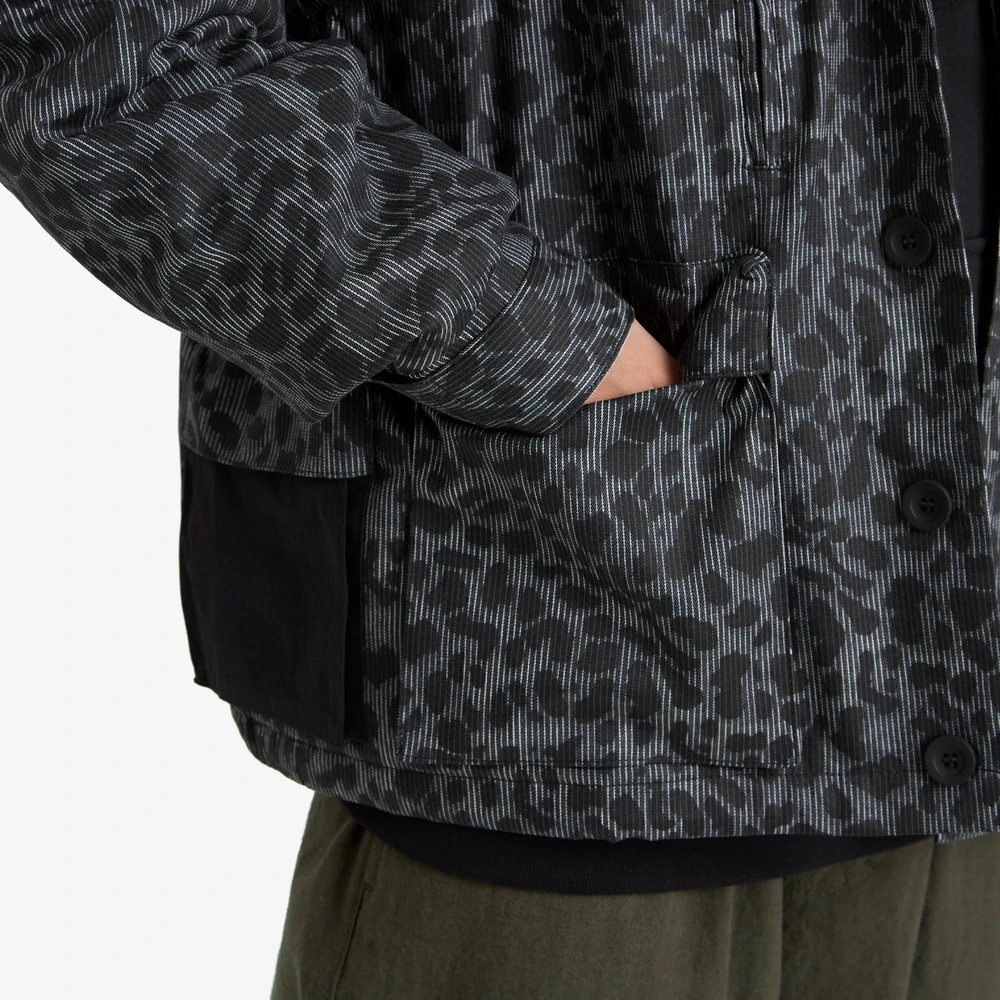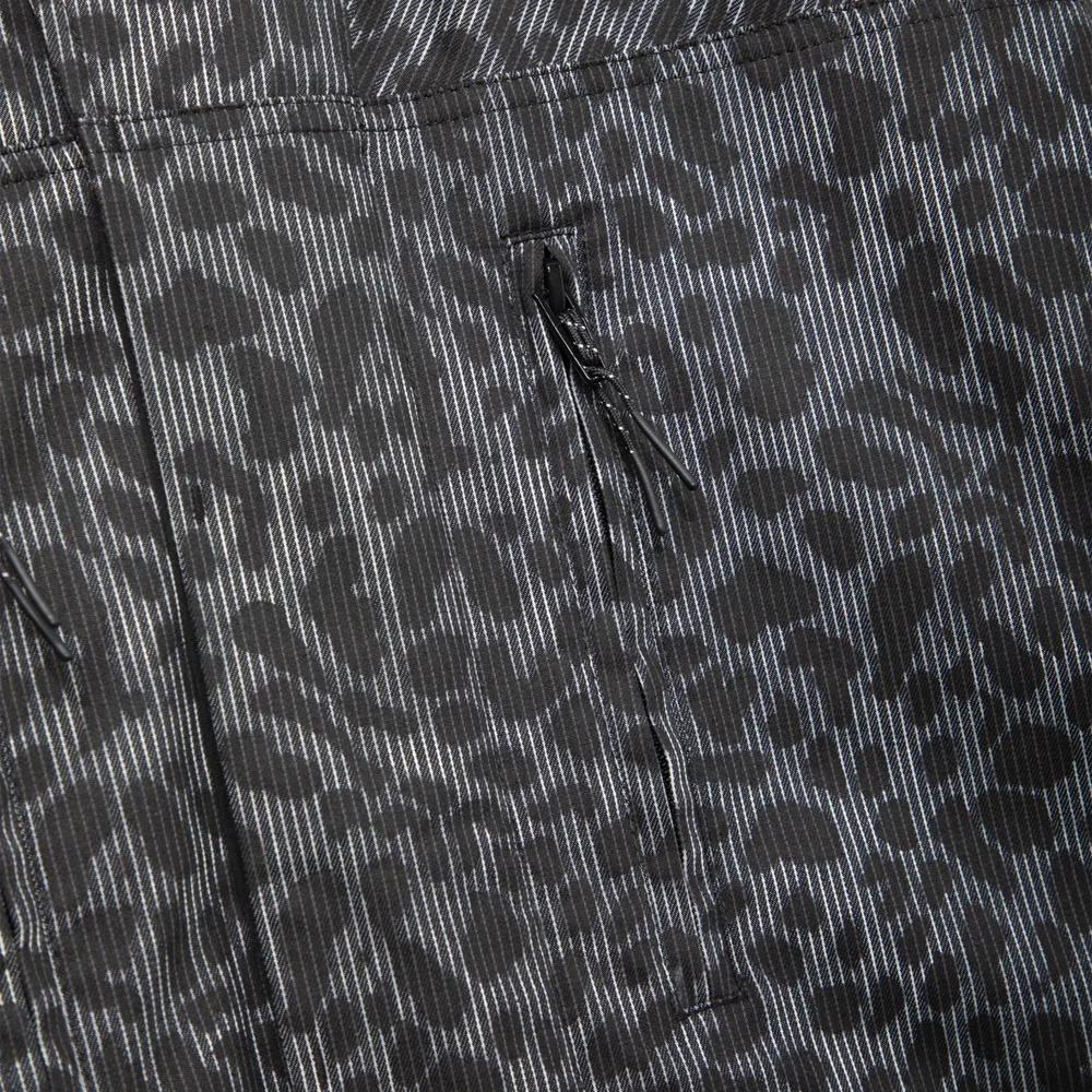 Внешняя сторона куртки сделана из хлопковой ткани с необычным узором, сочетающим в себе вертикальную полоску и леопардовый паттерн.