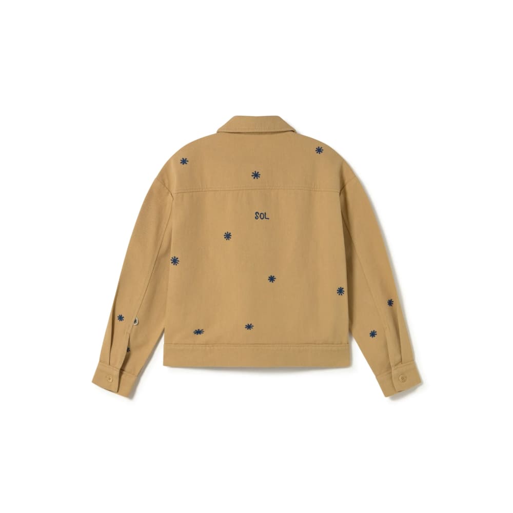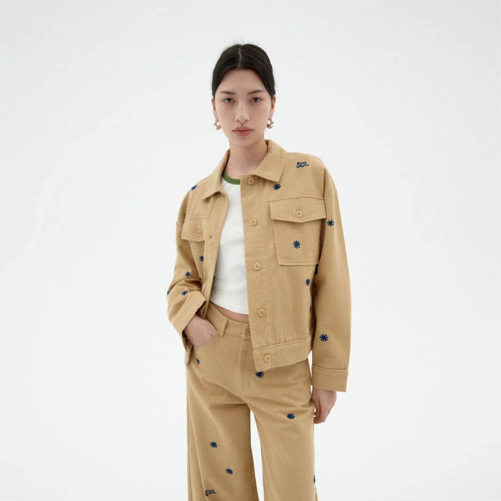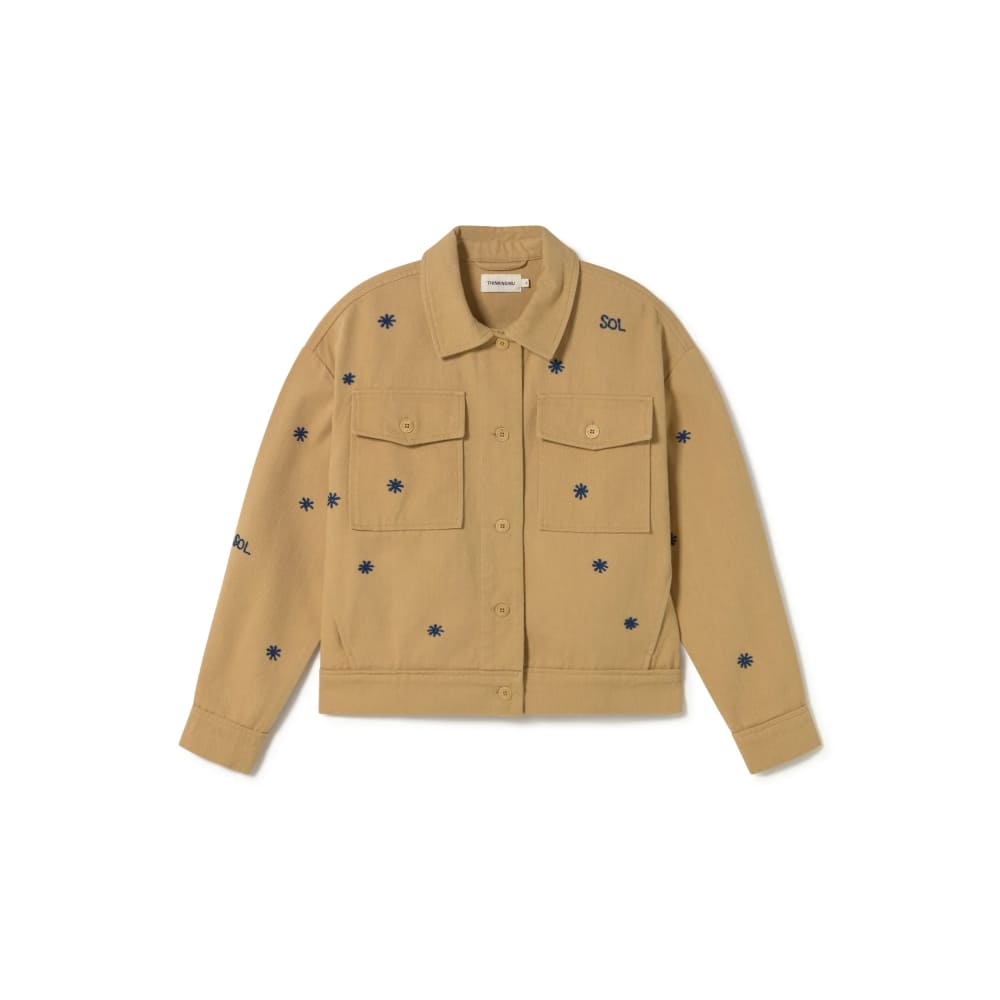 Бежевая куртка с вышитыми солнышками из органического хлопка от испанского бренда Thinking Mu.