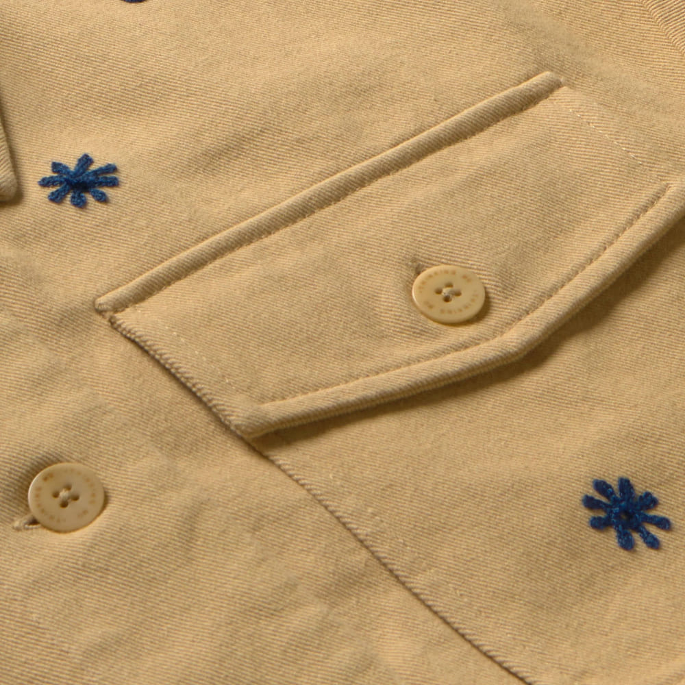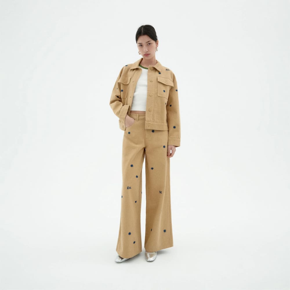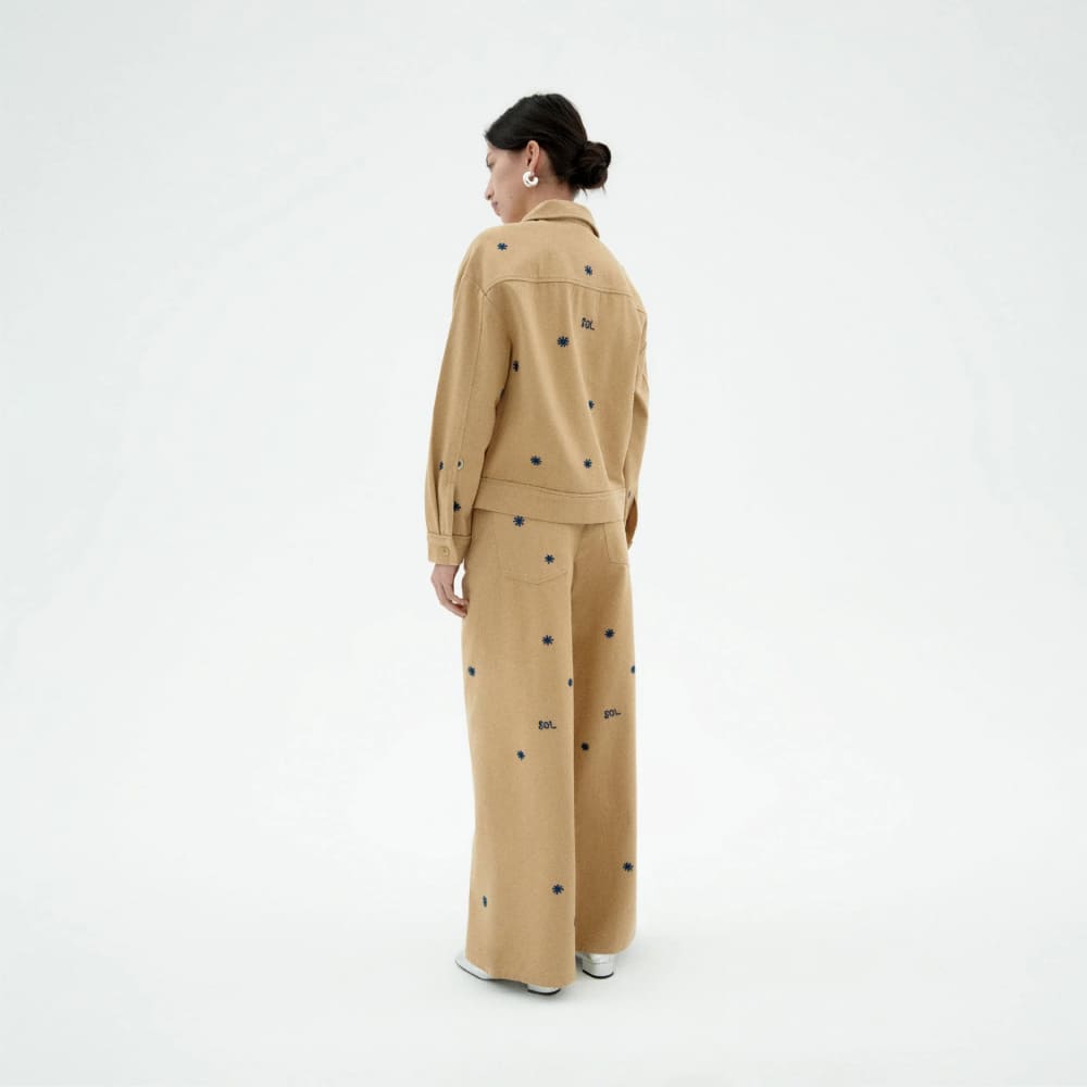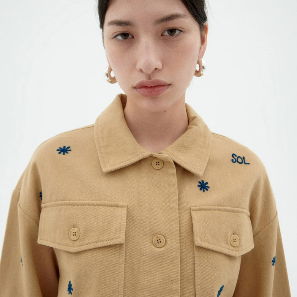Бежевая куртка с вышитыми солнышками из органического хлопка от испанского бренда Thinking Mu.