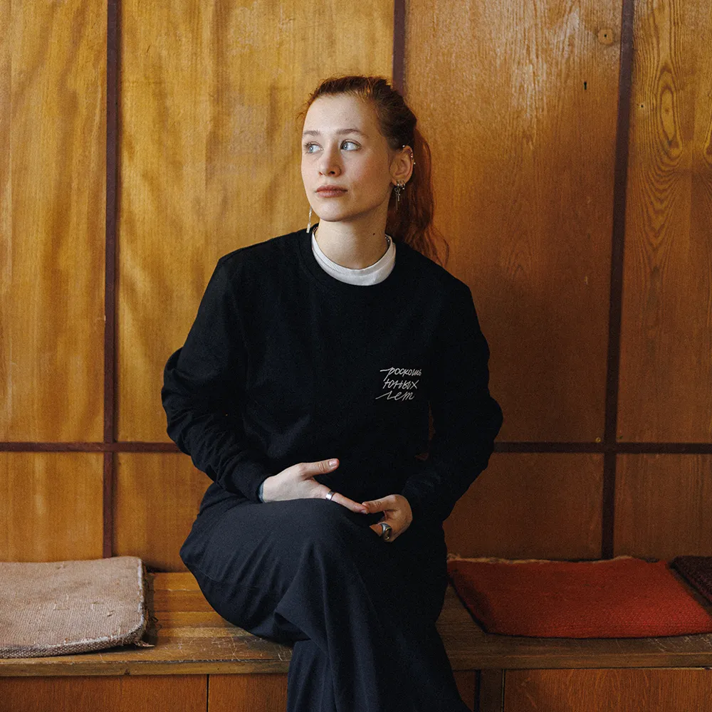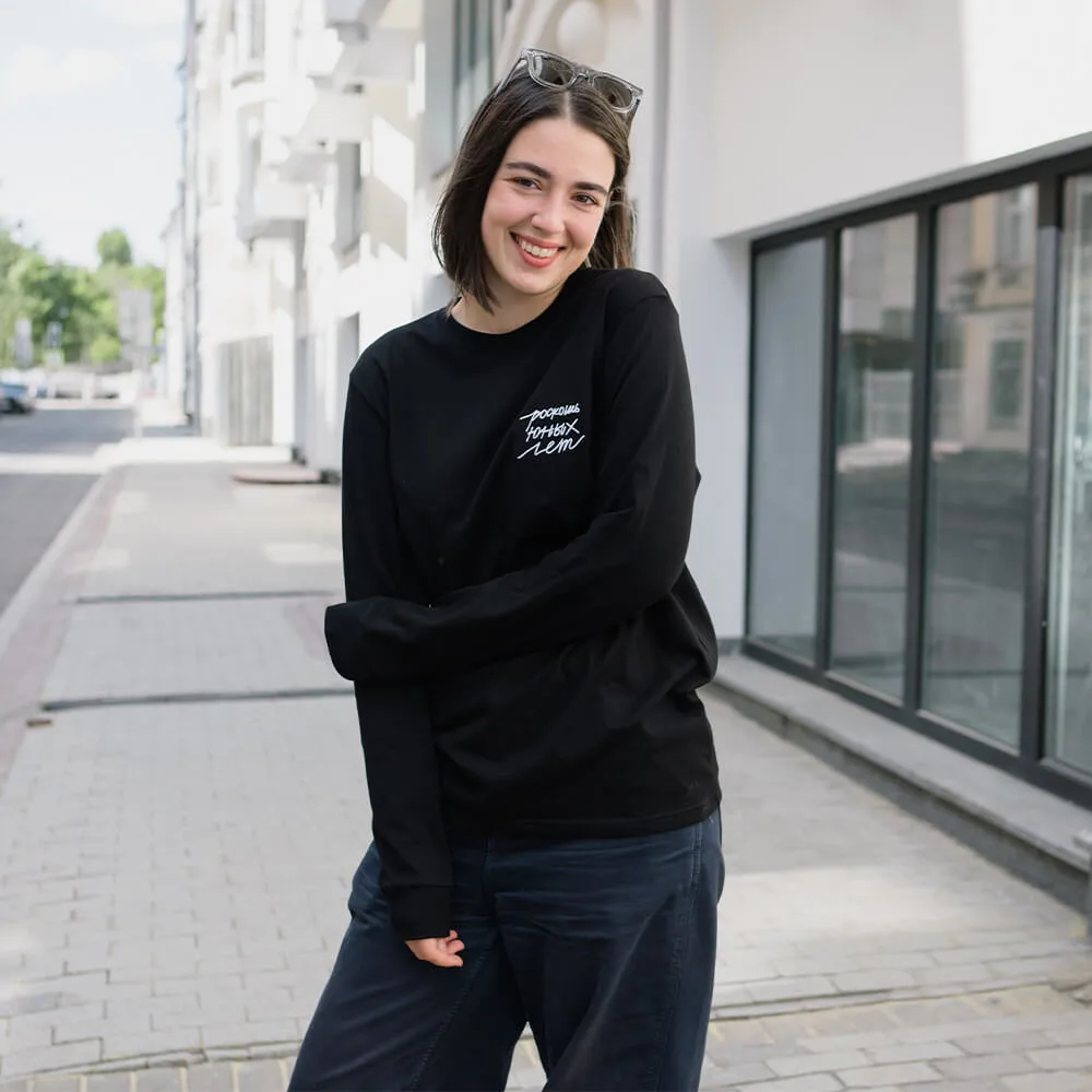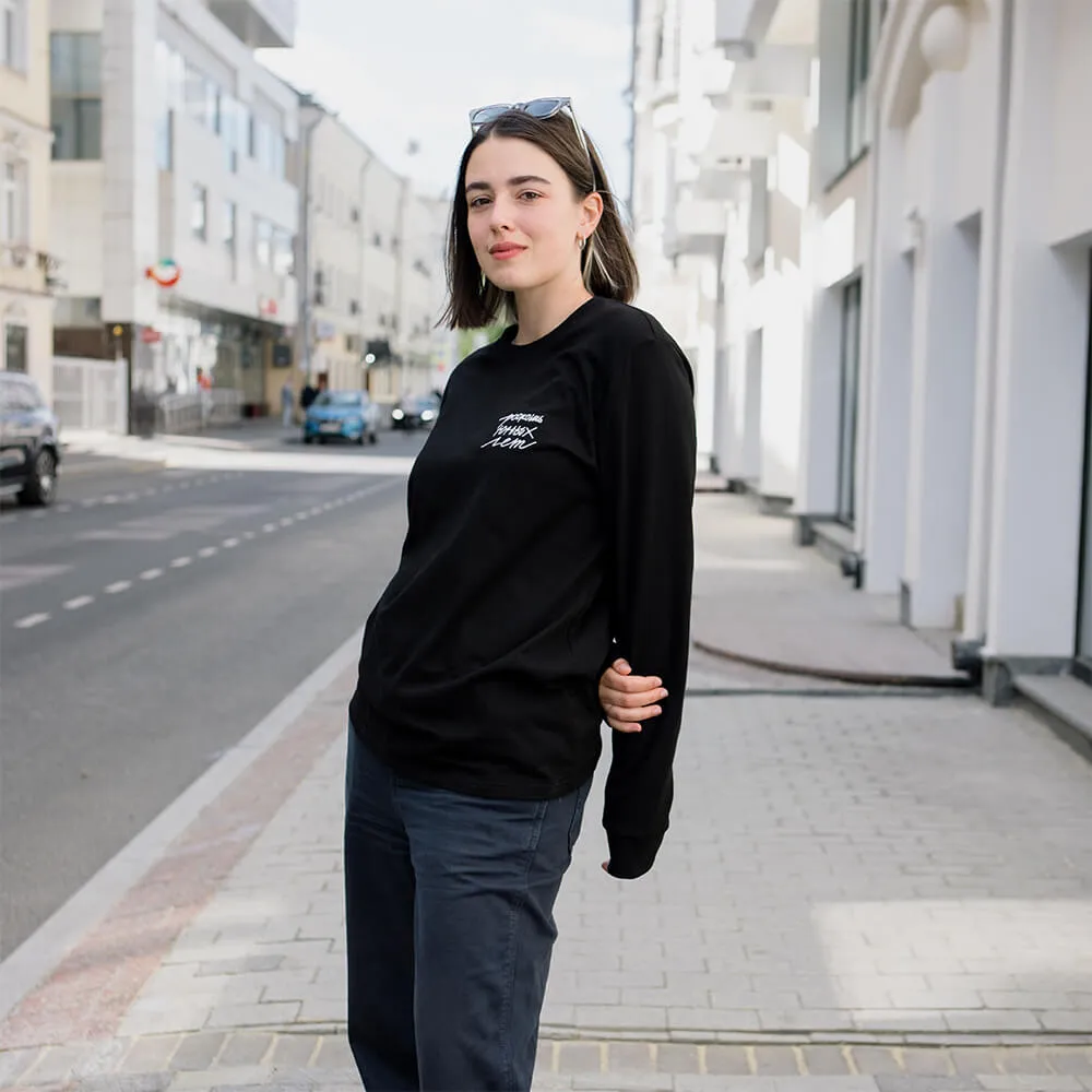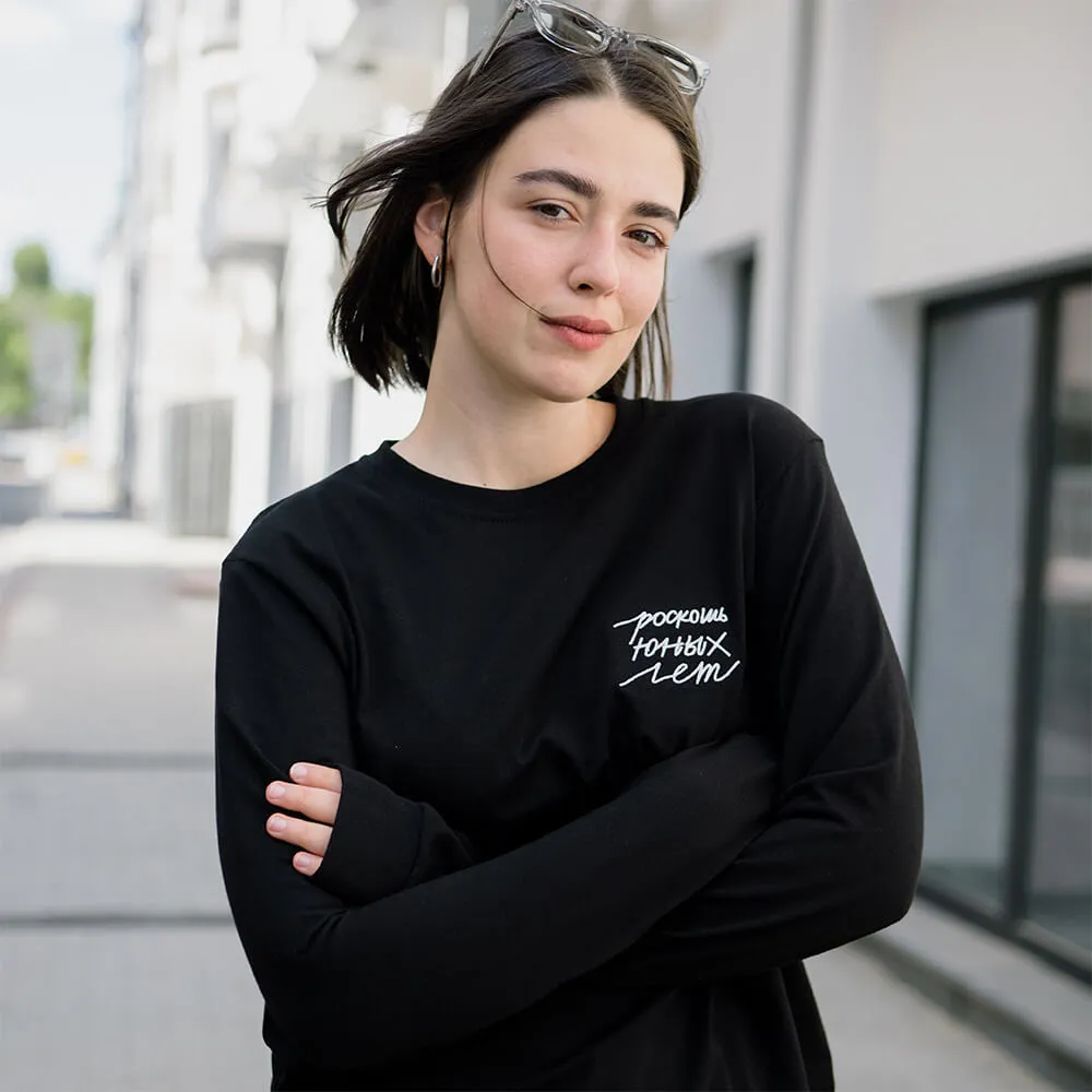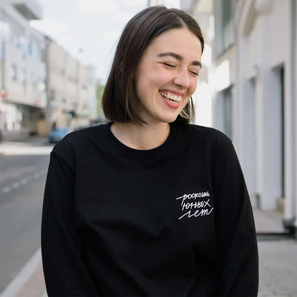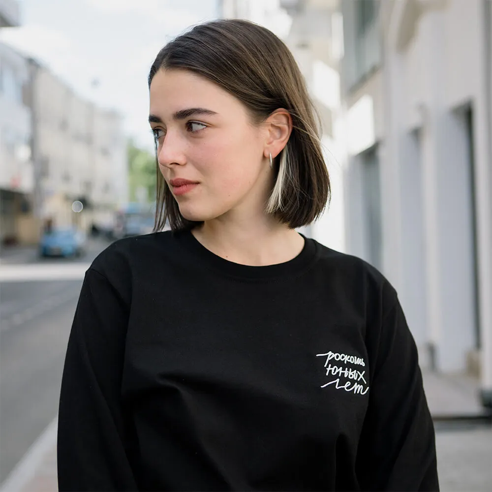 Роскошный черный немного оверсайз лонгслив с классной вышивкой с фразой из Евгения Онегина.