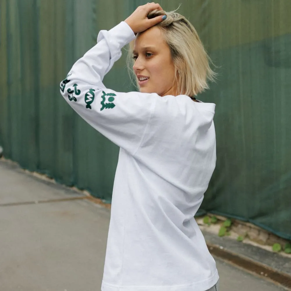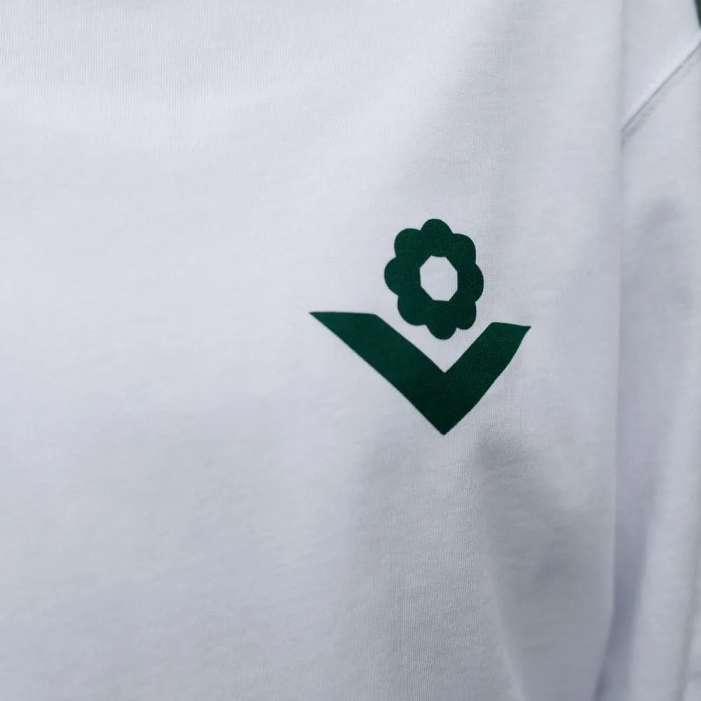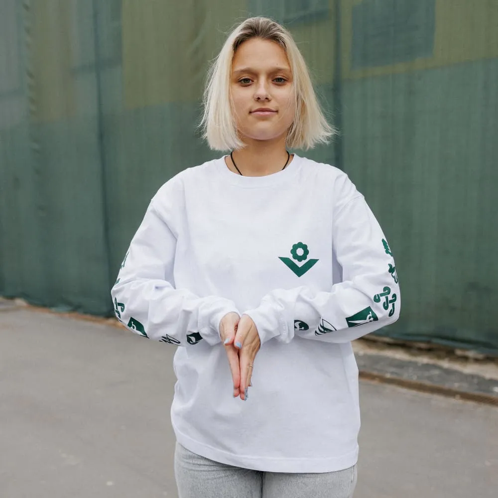 Свободный и удобный лонгслив из хлопка средней плотности. На груди — минималистичная графика, а на рукавах — цветочные принты, будто напоминание о тёплых днях и простых радостях.
