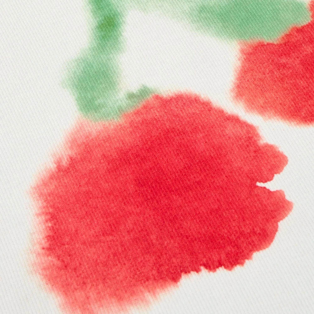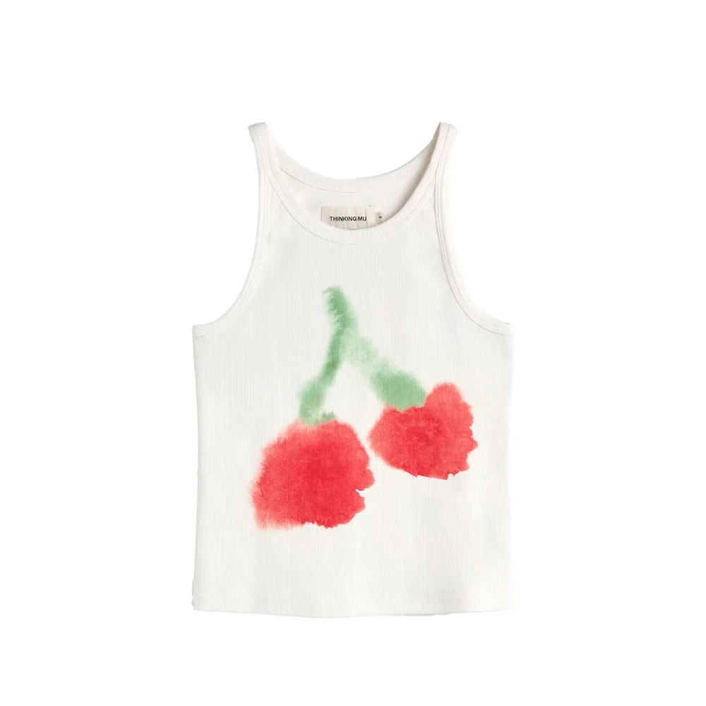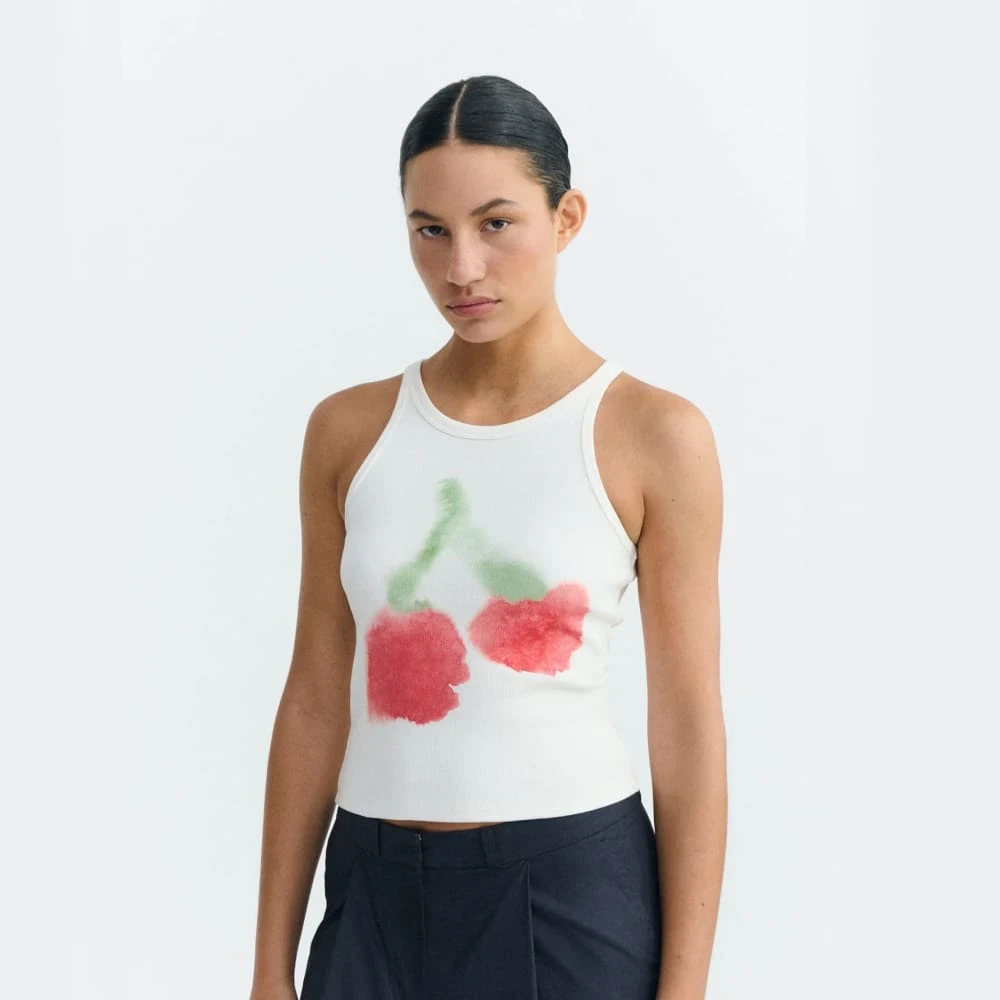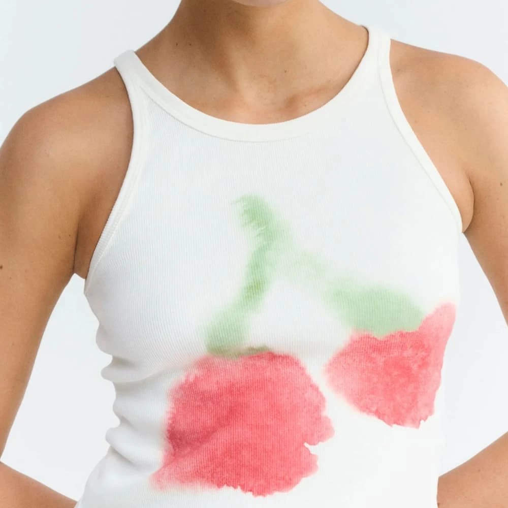 Летний топ с ярким вишневым размытым принтом, идеально подходящий для неспешных посиделок на уличной веранде от испанского бренда Thinking Mu, вдохновленного Средиземноморьем.