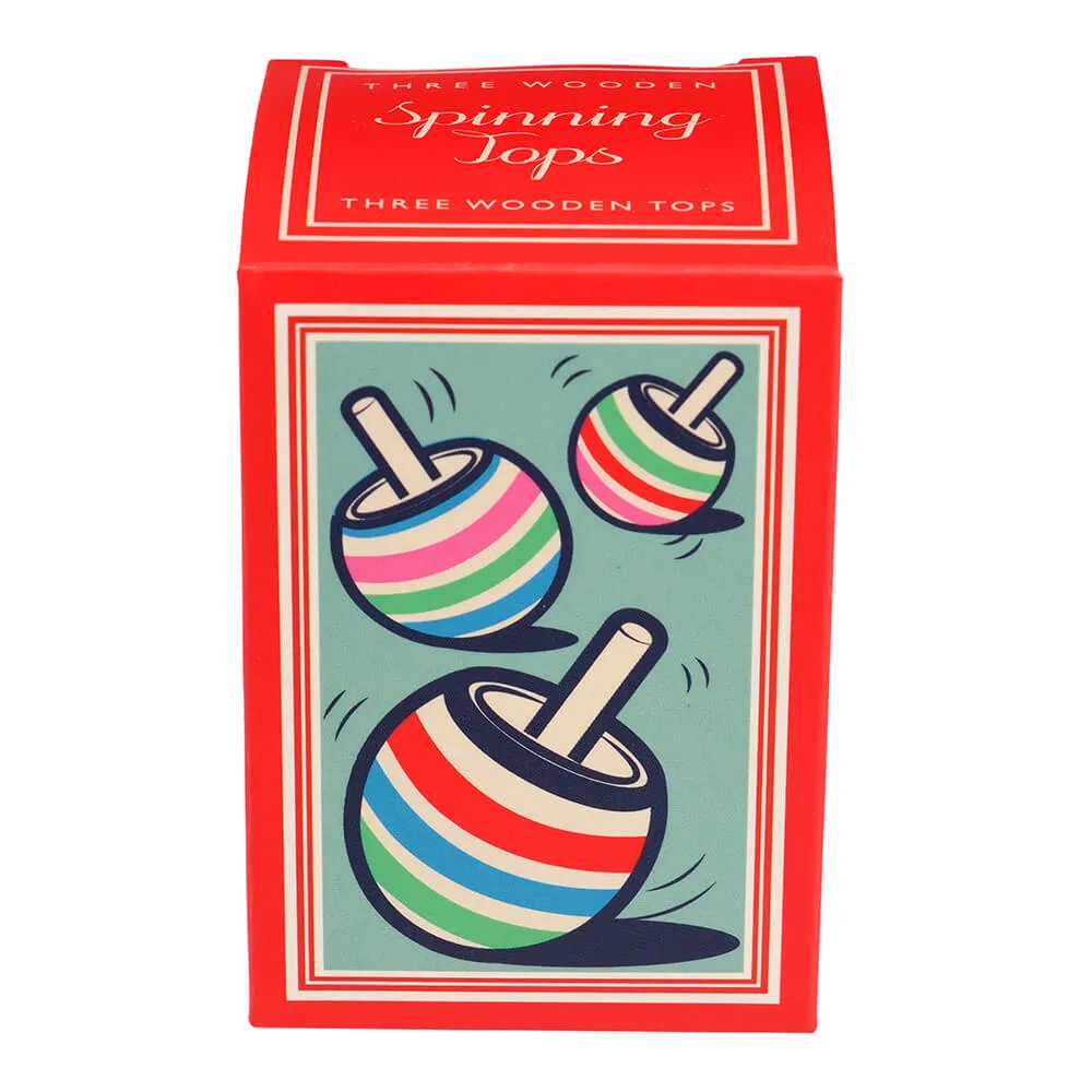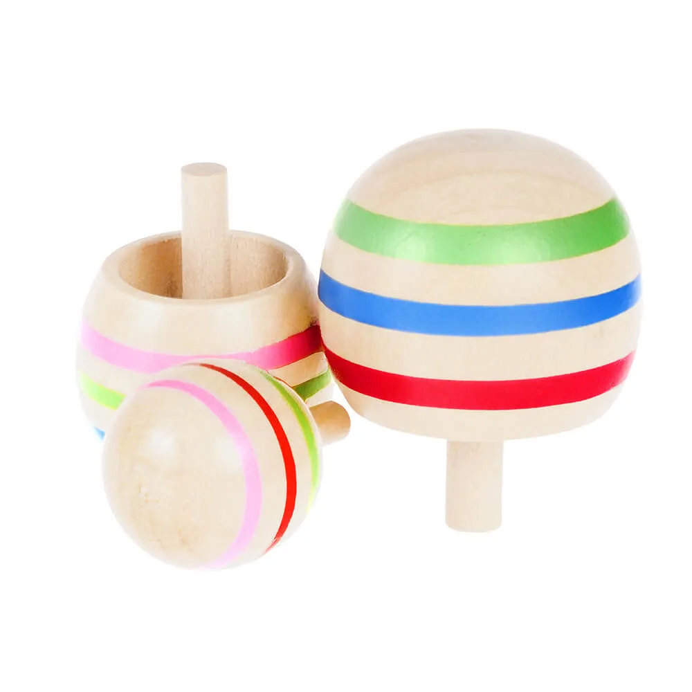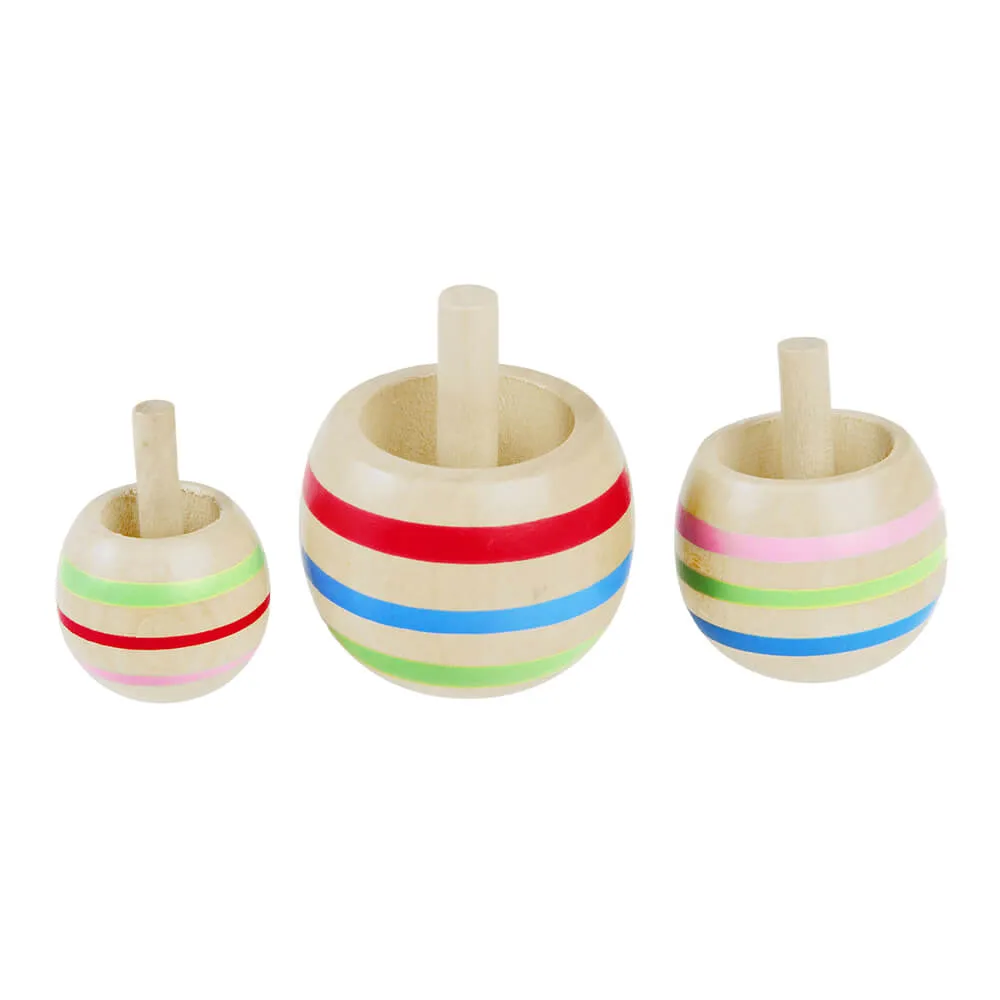 Набор из 3х деревянных мини-волчков разного размера с разноцветными полосками.