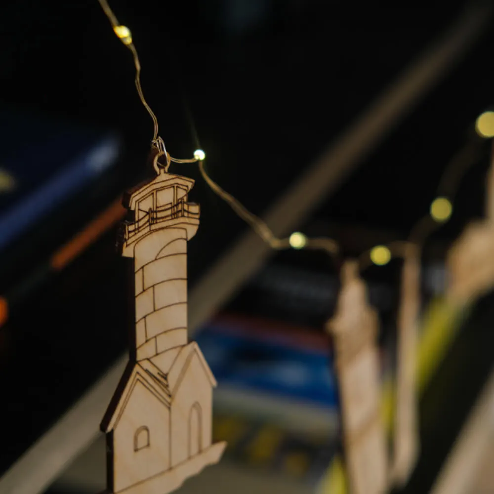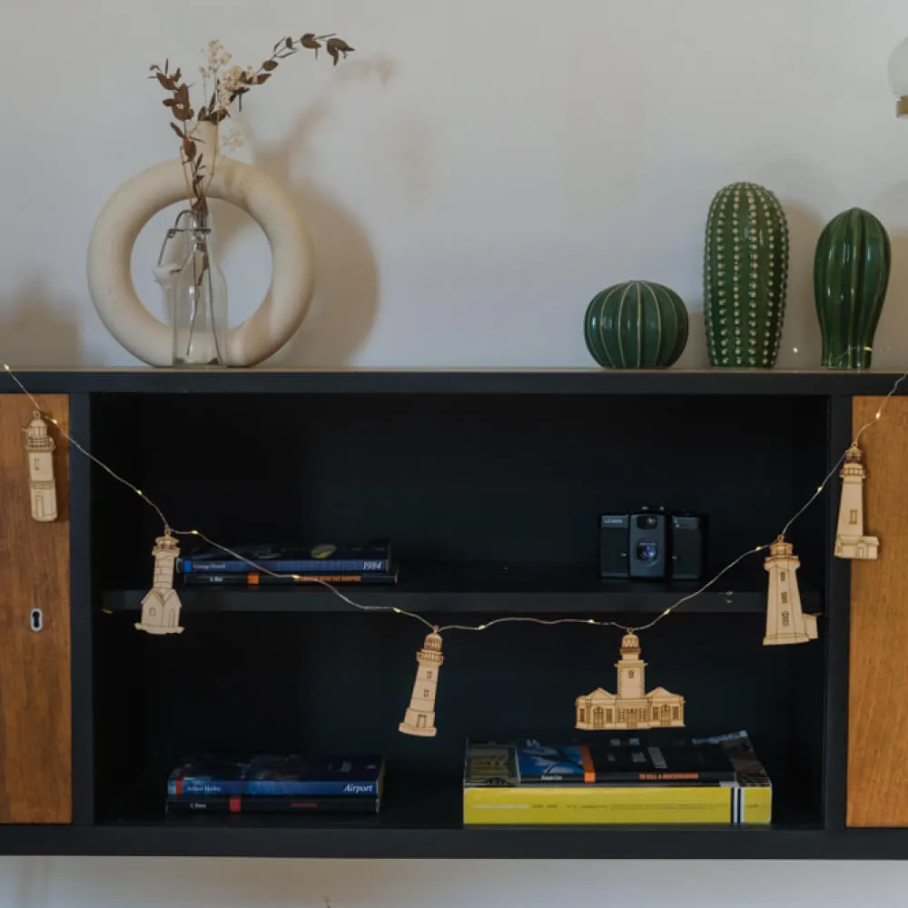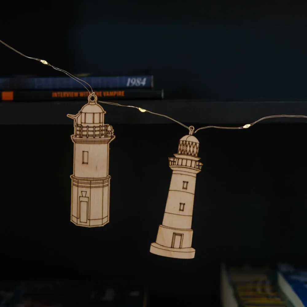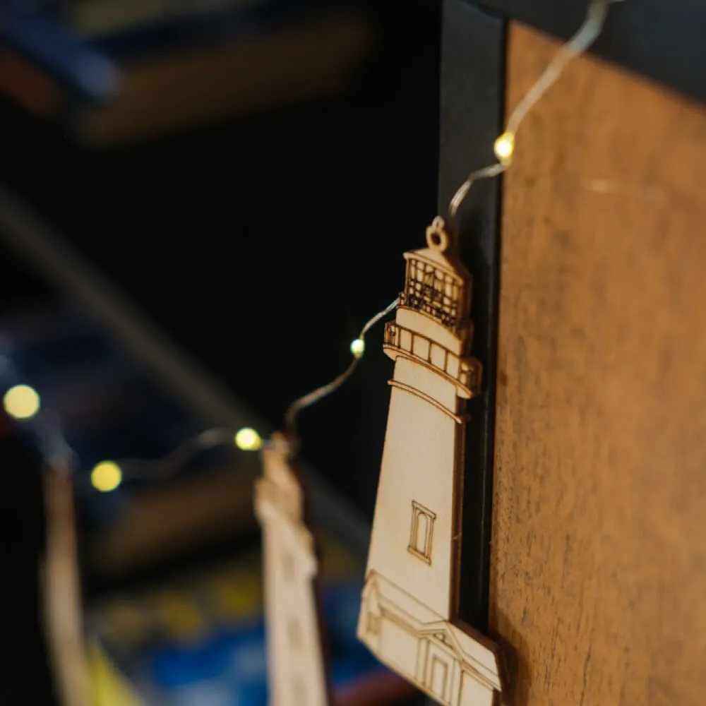 Гирлянда на батарейках с деревянными подвесами-маяками. Украсит любую стену, место над рабочим столом, коллекцию маяков или открытые полки в вашем доме.