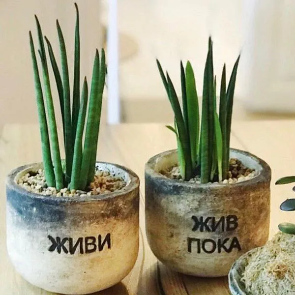 Фразы для надписей придуманы так, как будто это растение говорит её хозяину и одновременно как будто хозяин говорит растению.