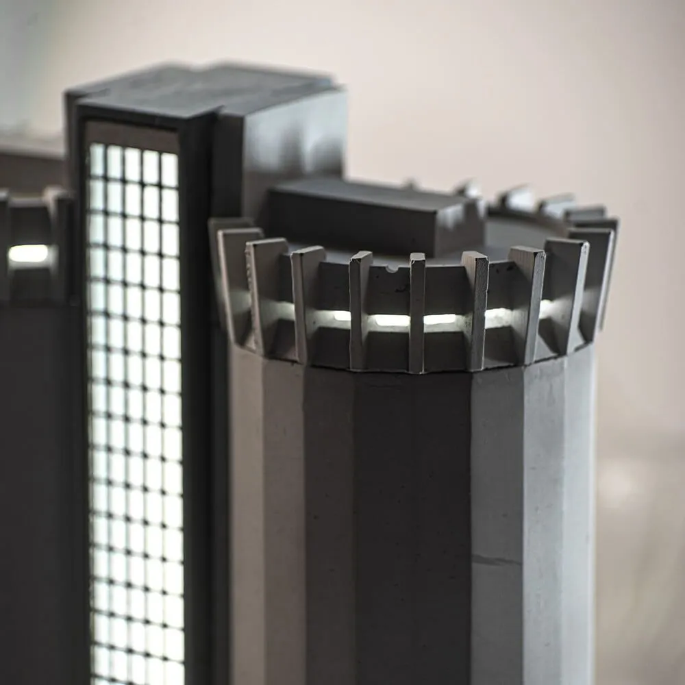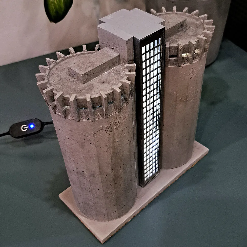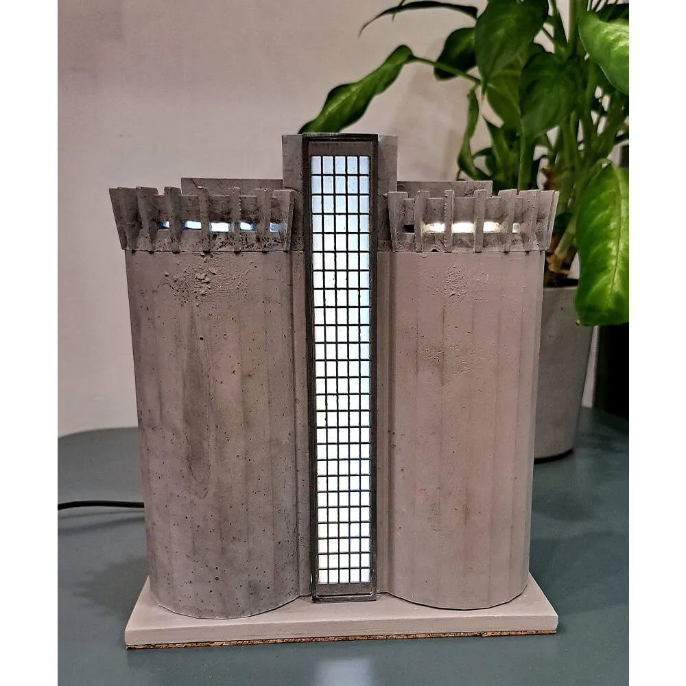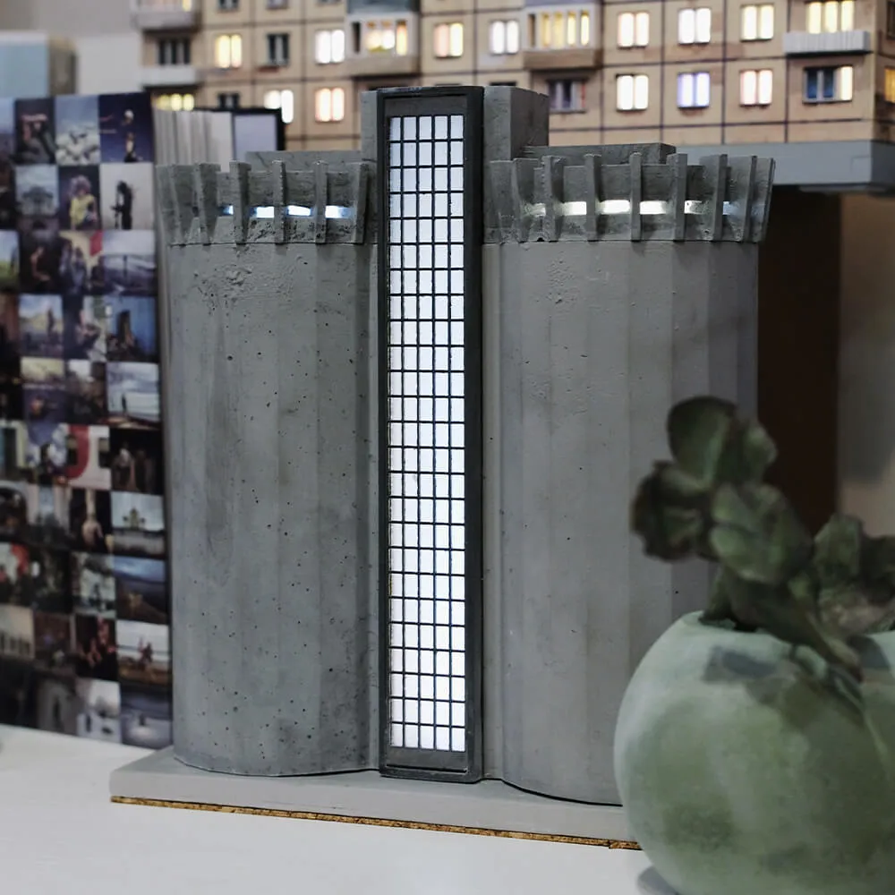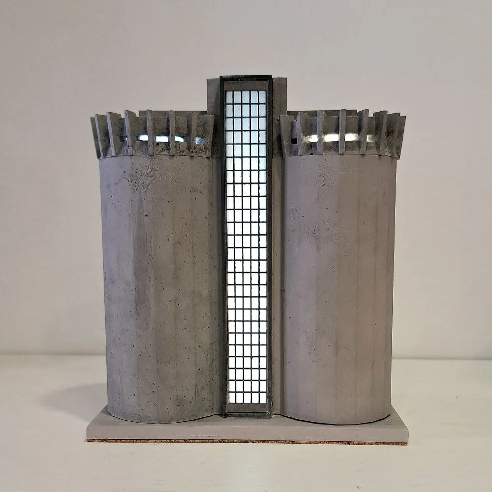Это модель первого в Советском Союзе бетонного элеватора вертикального типа, построенного монолитно. Используемые материалы - железобетон, металл и стекло. Грубые формы и внешний вид, прямые углы, монументальность.