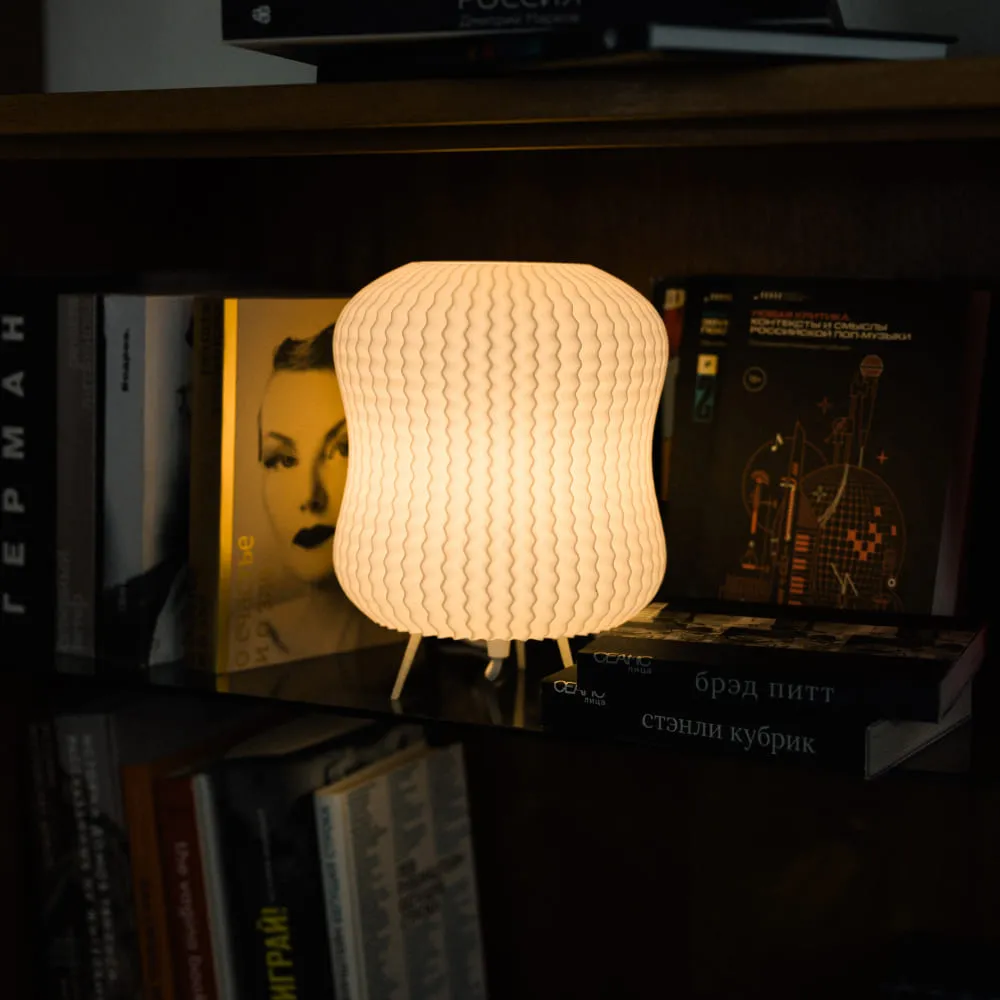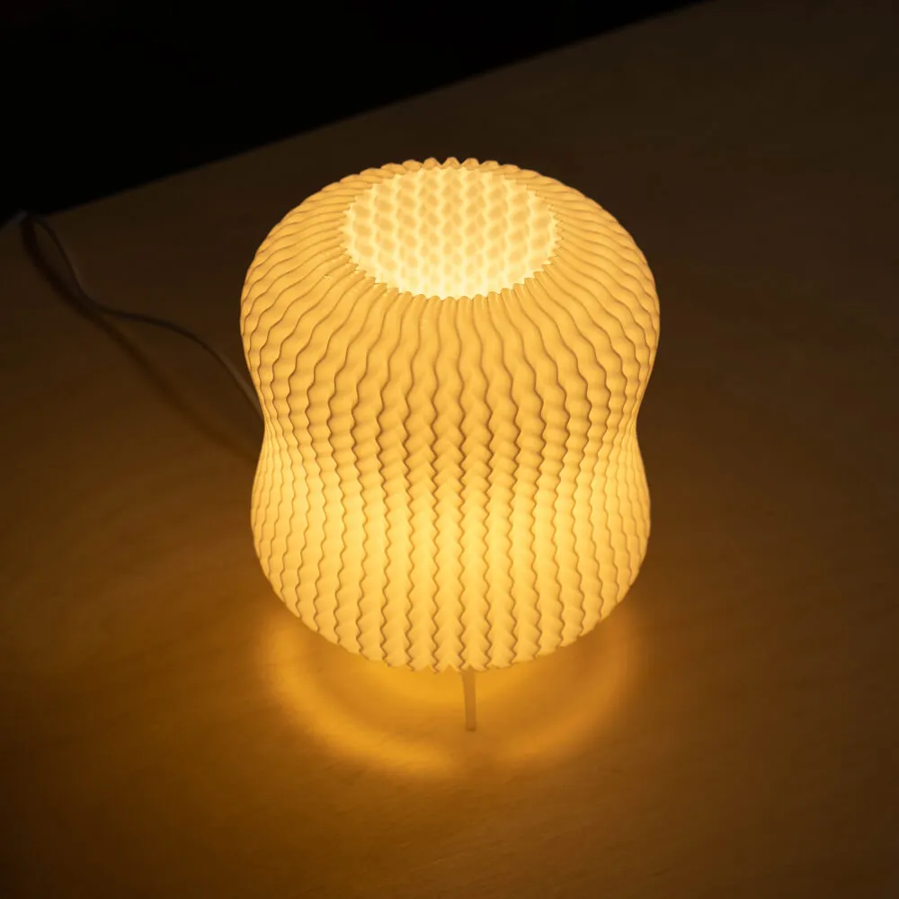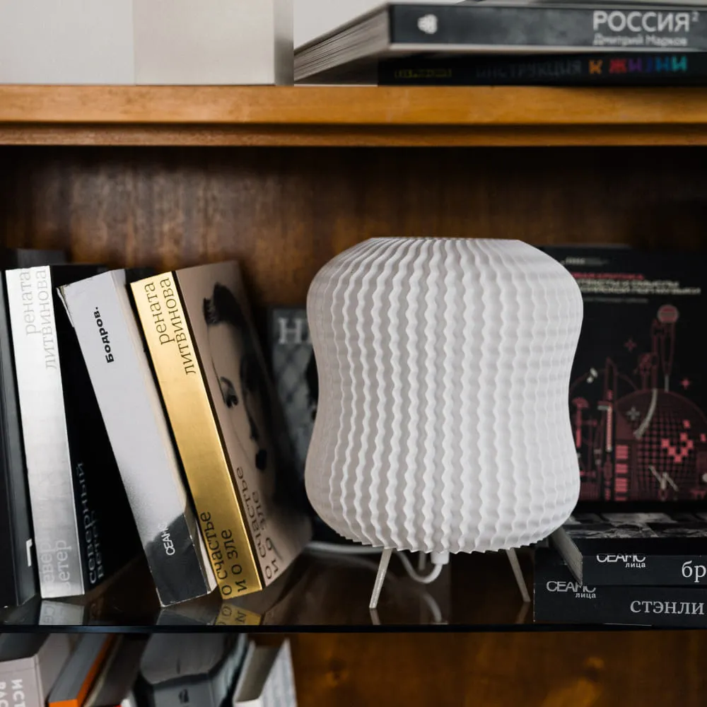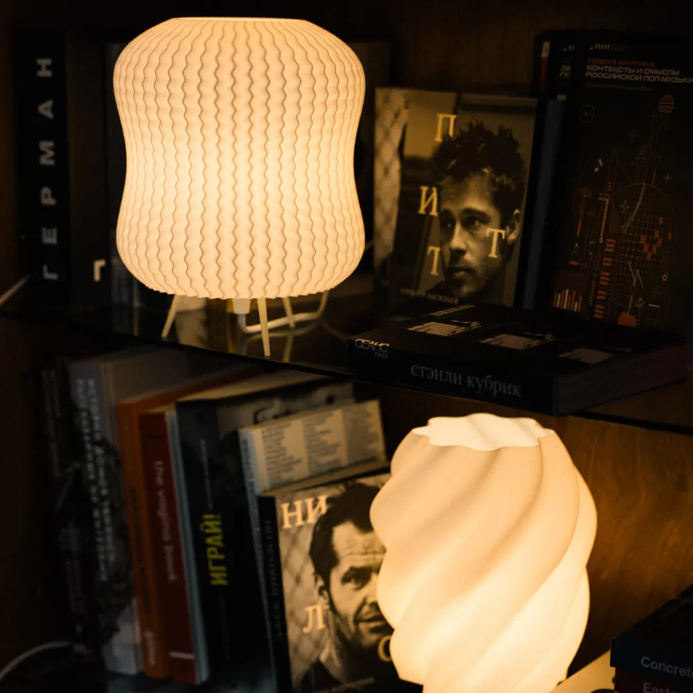 Одним из референсов при проектировании был арахис в скорлупе. Параметрический волнистый паттерн являет собой упорядоченную математикой природу. Прозрачная версия светильника неожиданно стала напоминать ретро бра из стекла.