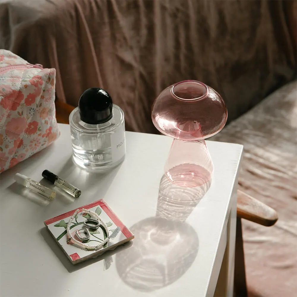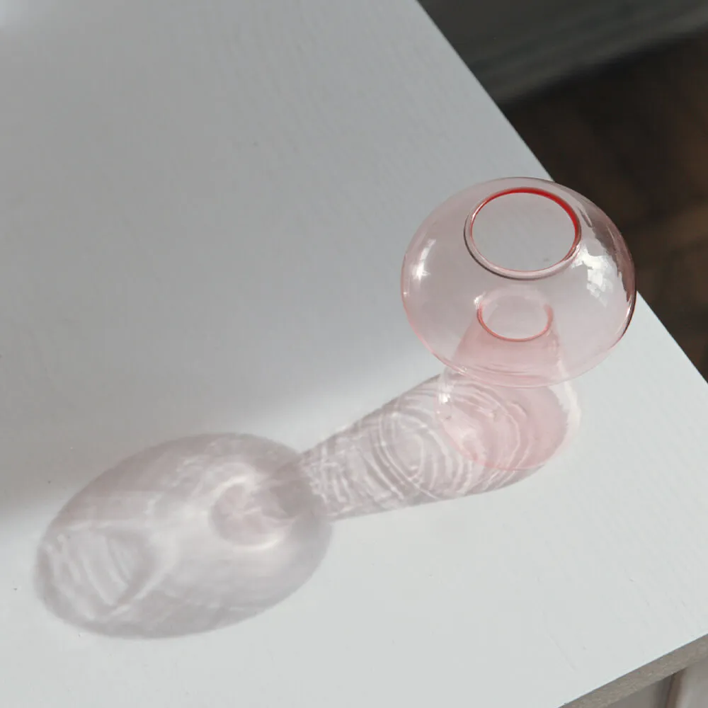 Стеклянная прозрачная розовая ваза в форме гриба.