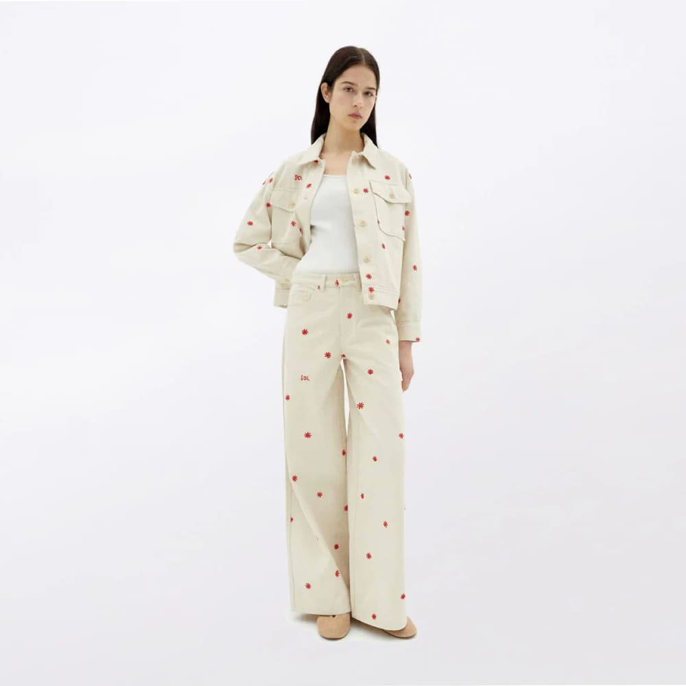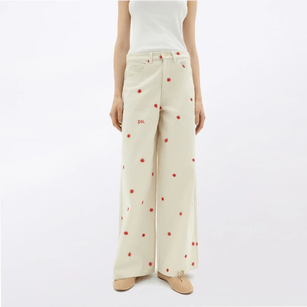 Белые брюки с вышитыми солнышками из органического хлопка от испанского бренда Thinking Mu.