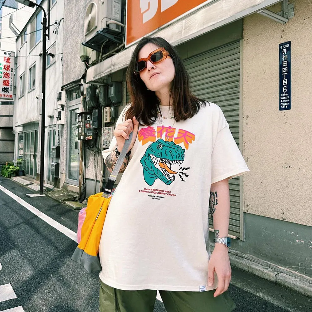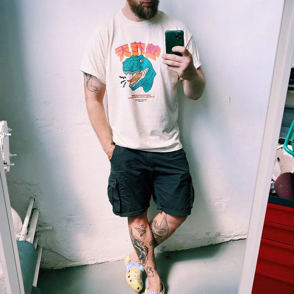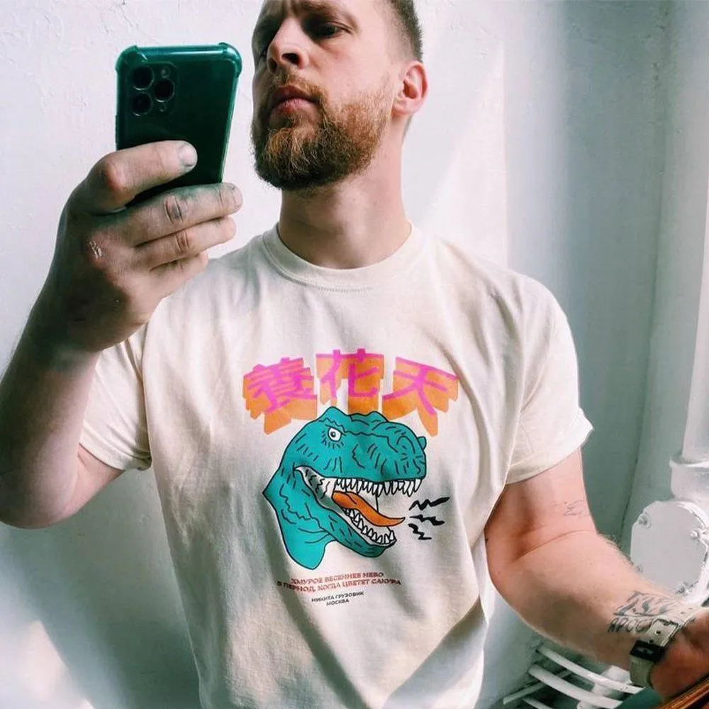 Футболка с мощным динозавром с весенними молниями любви и нежности, вырывающимися из его зубастой пасти и направленными на своих родных, близких, друзей, маму, собачек, кошечек, птичек, дельфинов и разных рыб, на всех тех, кто хороший, приятный и его не огорчает, а если и огорчает, то всегда готов честно, открыто и ничего не скрывая обсудить с ним свои и его чувства.