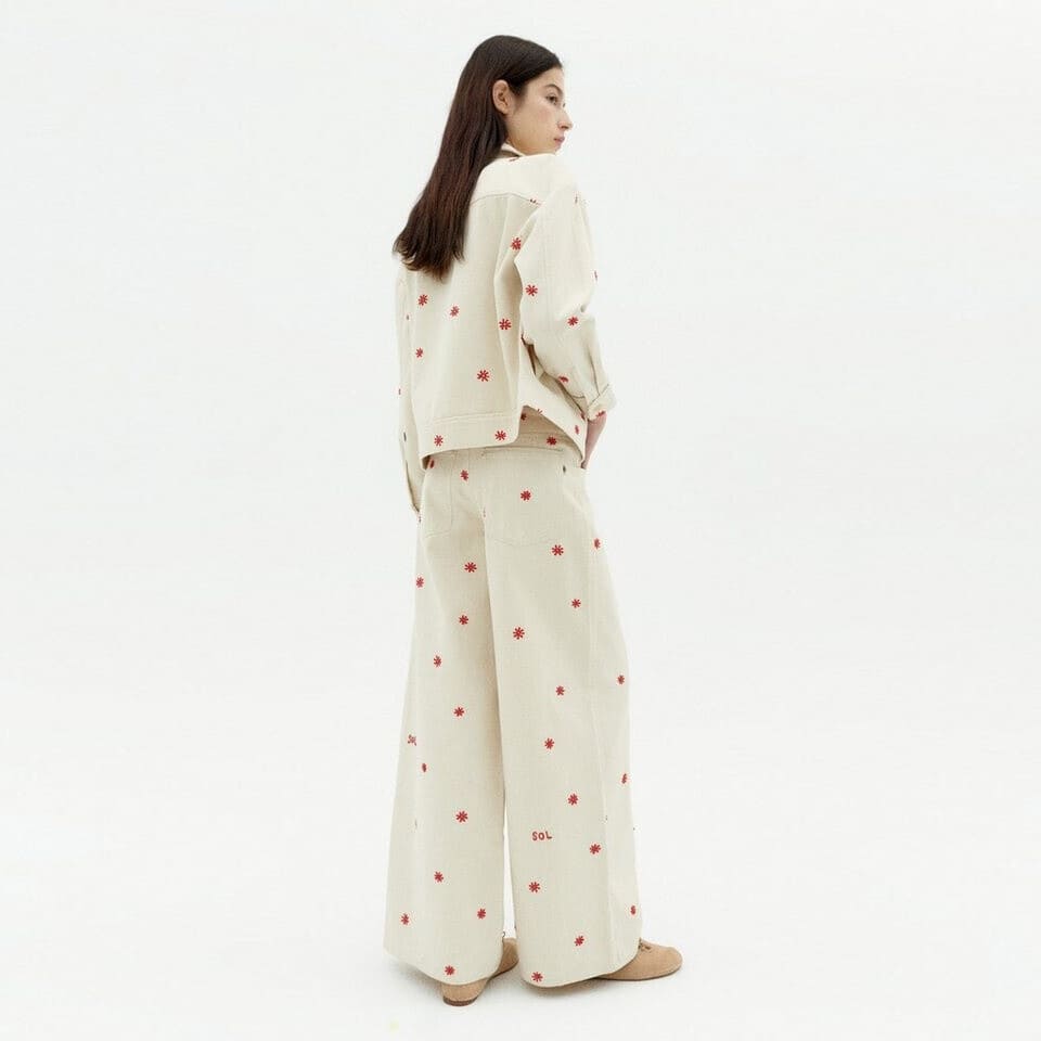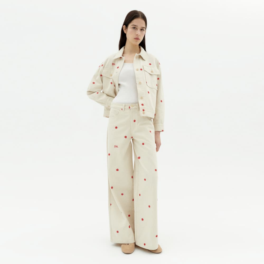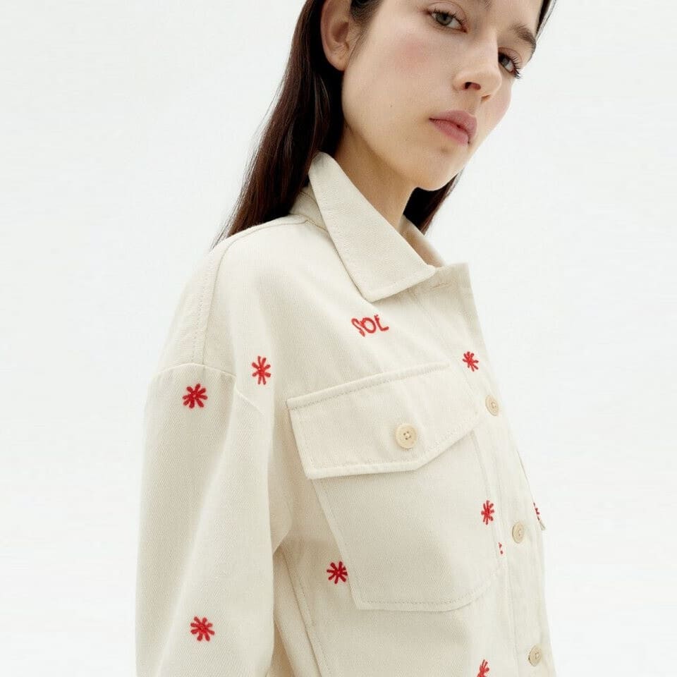 Бежевая куртка с вышитыми солнышками из органического хлопка от испанского бренда Thinking Mu.
