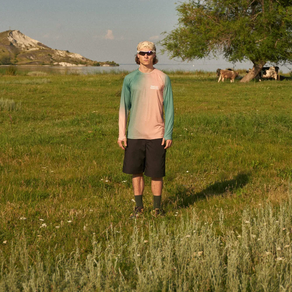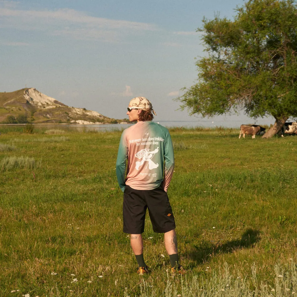 Особая посадка с нестандартным расположением швов для удобства использования во время занятий спортом. Модель состоит из множества деталей, необходимых для корректной посадки в движении, одна из них — специальные отверстия под большой палец, чтобы при активности лонг на рукавах не задирался.