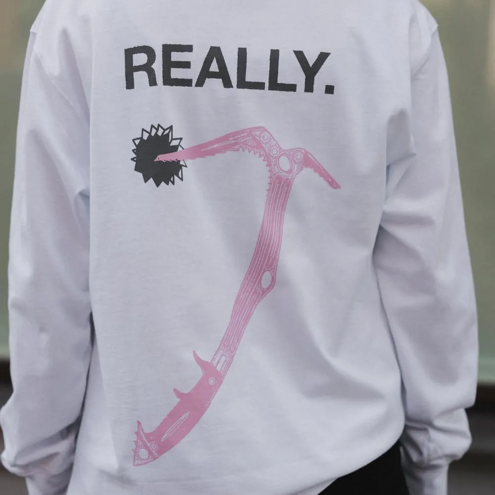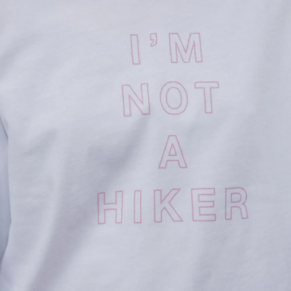 Свободный хлопковый лонгслив. Передняя часть украшена слоганом "I'M NOT A HIKER", а задняя — принтом с альпинистской киркой.