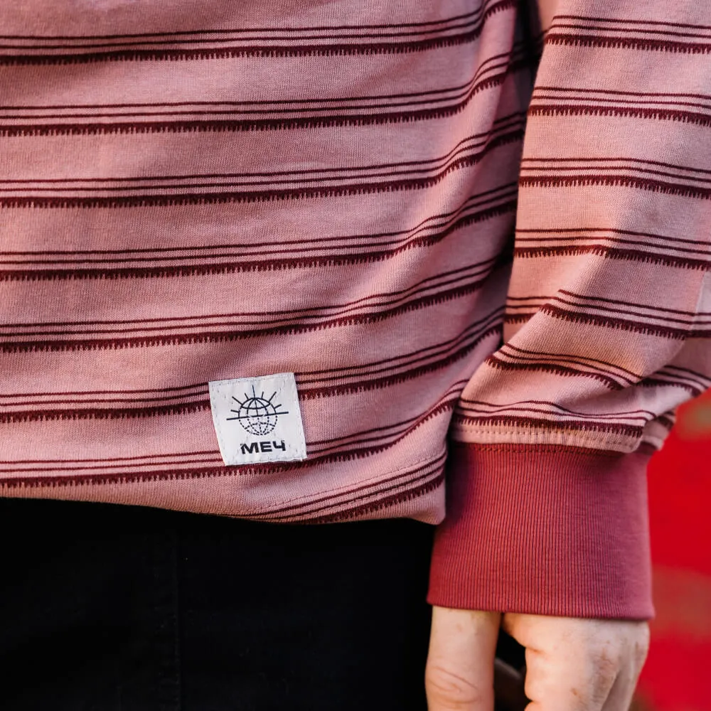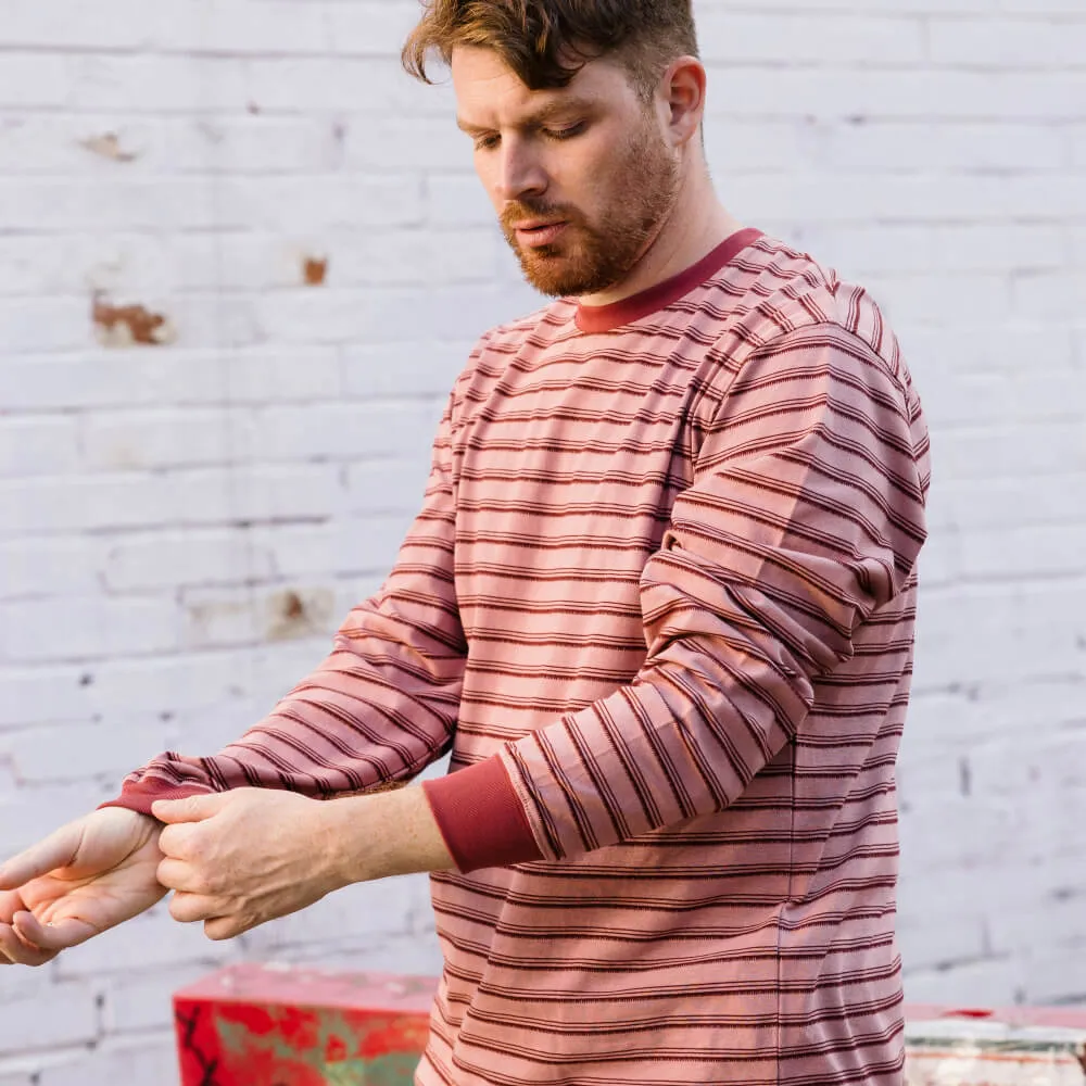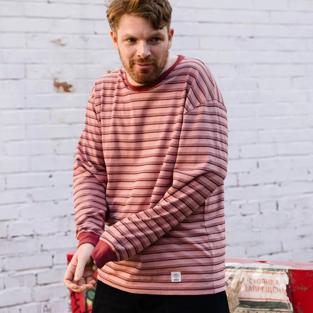 Розовый лонгслив с приятным тактильным узором в полоску и лаконичным силуэтом с нотками винтажного стиля Ivy League, подходящий как мужчинам, так и женщинам.