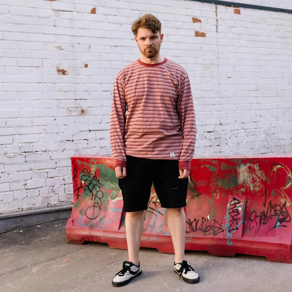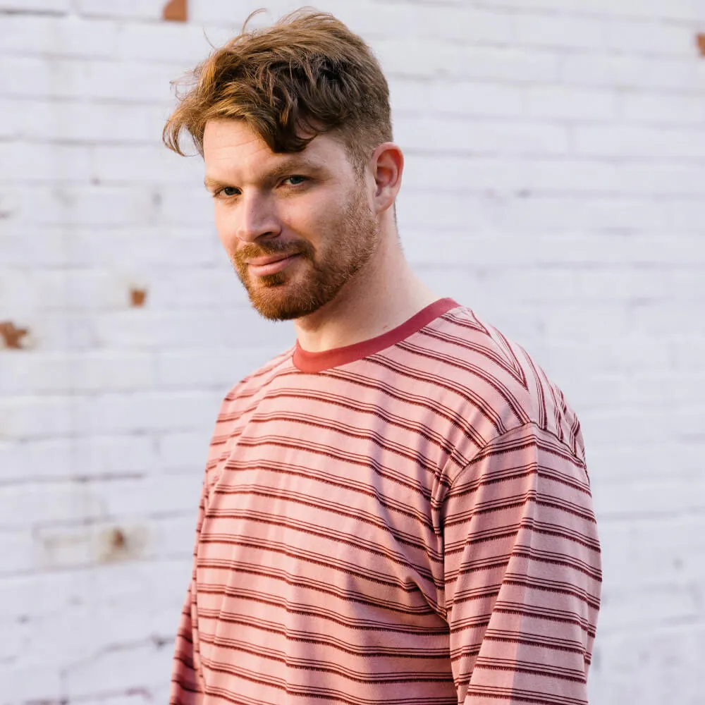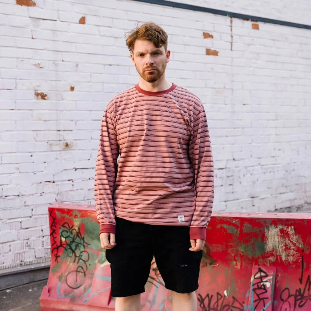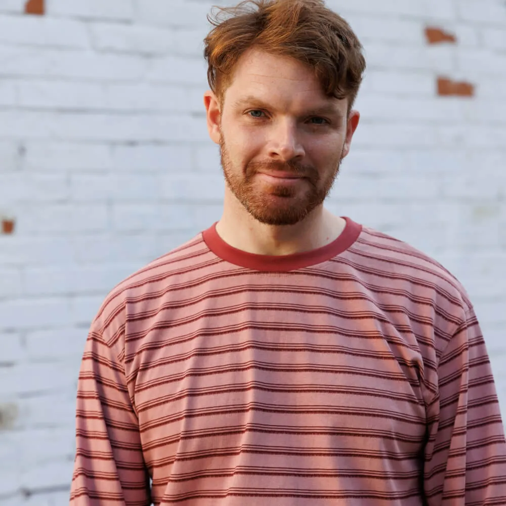 Розовый лонгслив с приятным тактильным узором в полоску и лаконичным силуэтом с нотками винтажного стиля Ivy League, подходящий как мужчинам, так и женщинам.