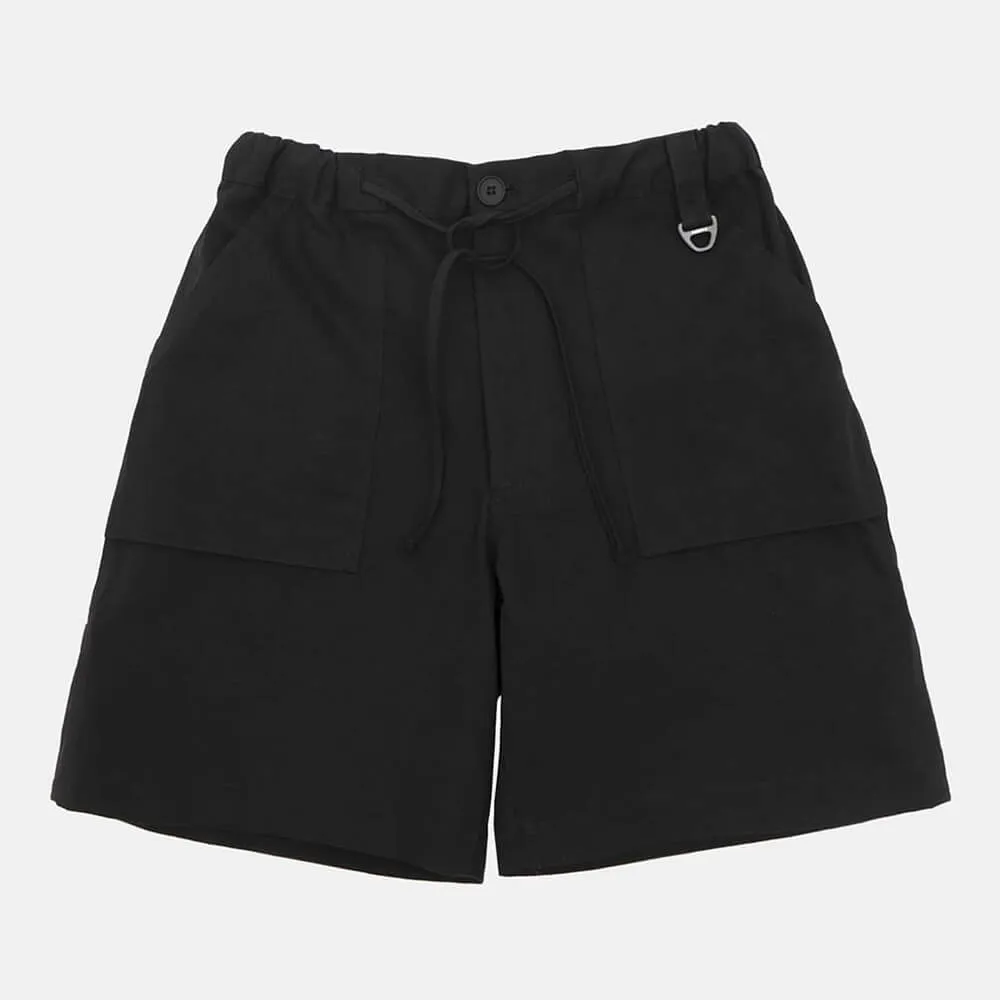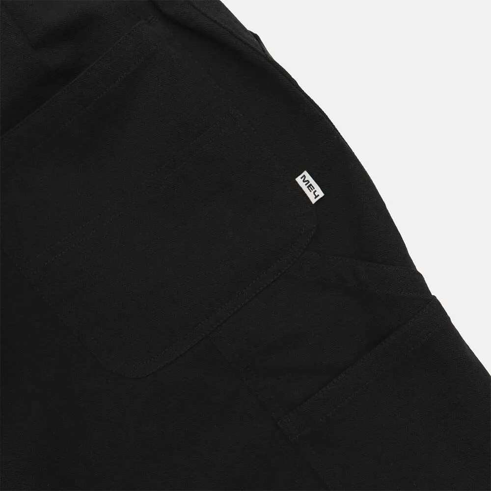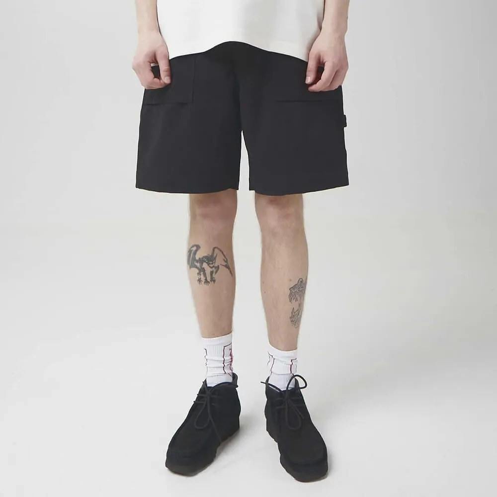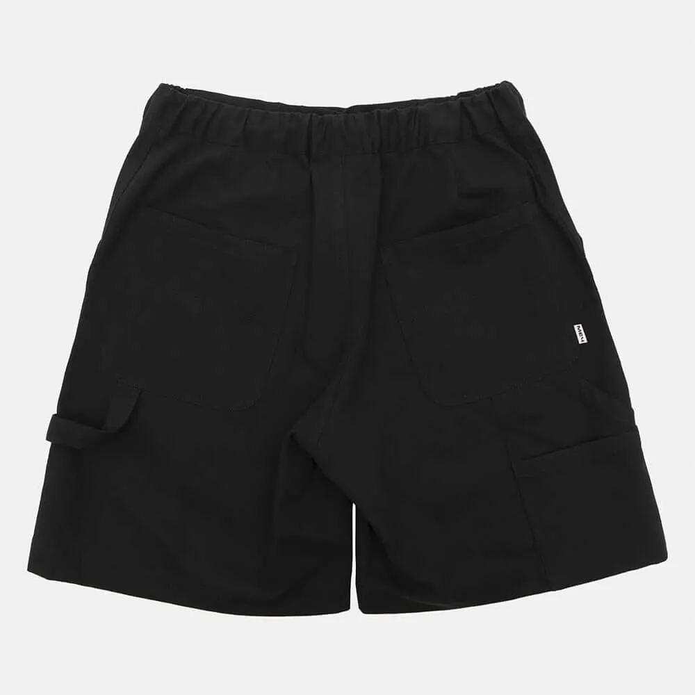 Черные шорты со свежим взглядом на винтажный рабочий фасон «Carpenter», сшитые из дышащей хлопковой ткани средней плотности с выразительной фактурой.