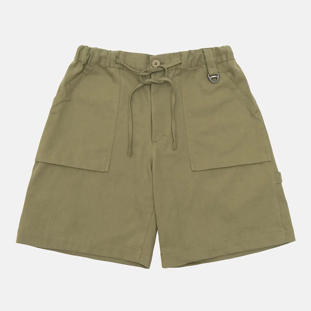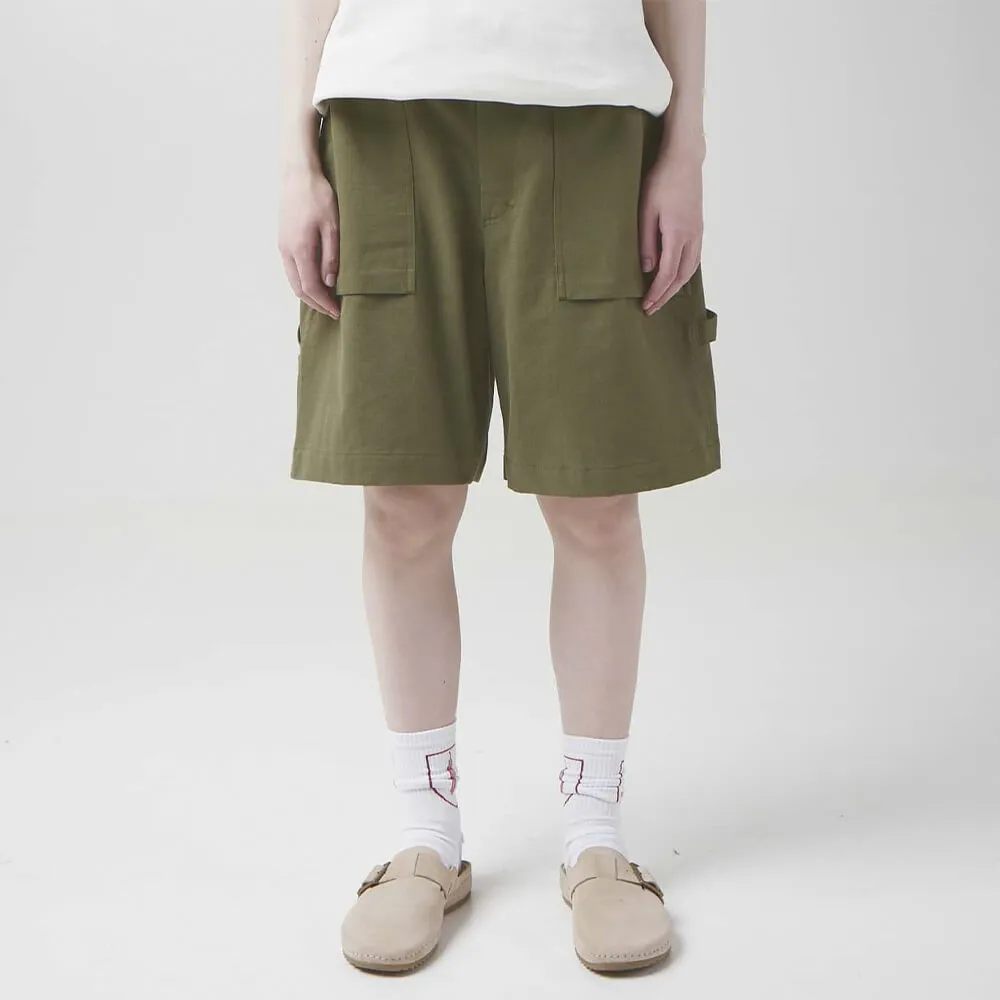 Зеленые шорты со свежим взглядом на винтажный рабочий фасон «Carpenter», сшитые из дышащей хлопковой ткани средней плотности с выразительной фактурой.